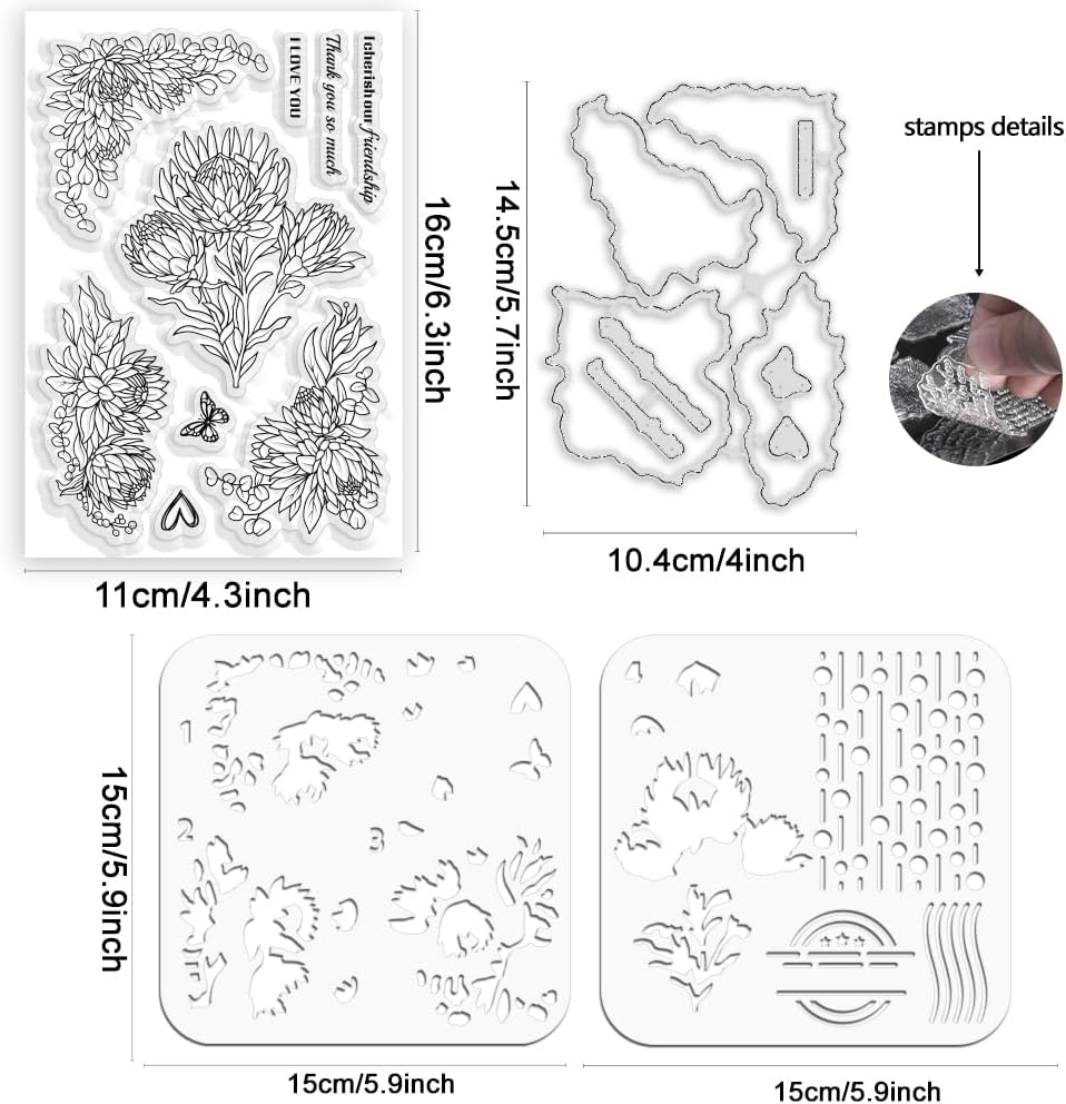 - Realistic Layering Protea Cynaroides Flower Stamps Dies and Stencil Set: You will receive 1 sheet clear stamps with various shapes of Flower and Branch, buds, and leaves, 1 set cut dies for cutting different petals and leaves shapes, and 2 PET stencils can be used to create color layering effects.