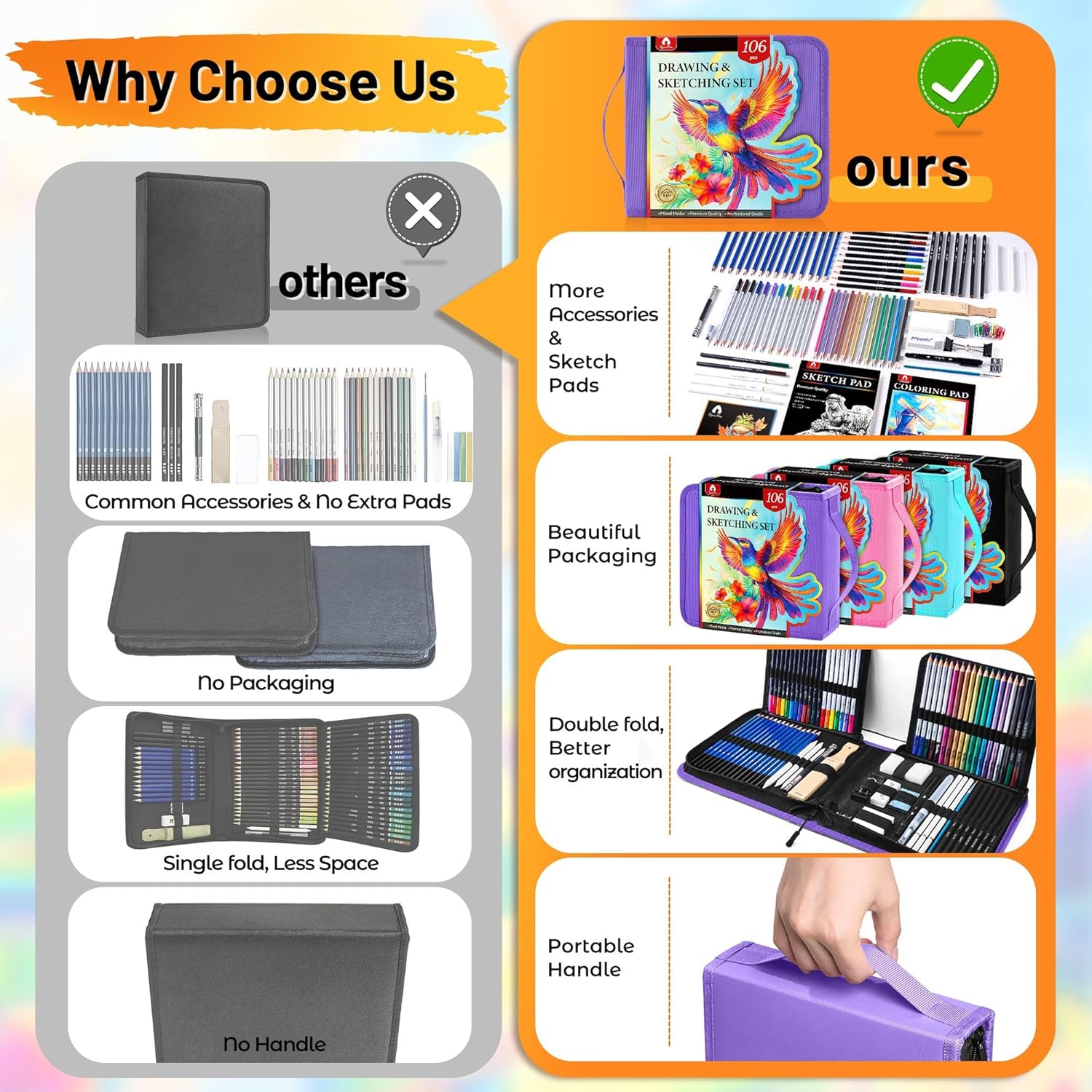 - 106 PCS Professional Drawing Kit Sketching Supplies: All you need are in this portable art case whether you are a professional or a beginner. It includes all the art supplies, specially added 3-color sketchbook and coloring book. Perfect for drawing, sketching, shading, blending, layering and adult coloring books. With our professional drawing supplies kits, let your imagination flow and bring your ideas to your artistic journey