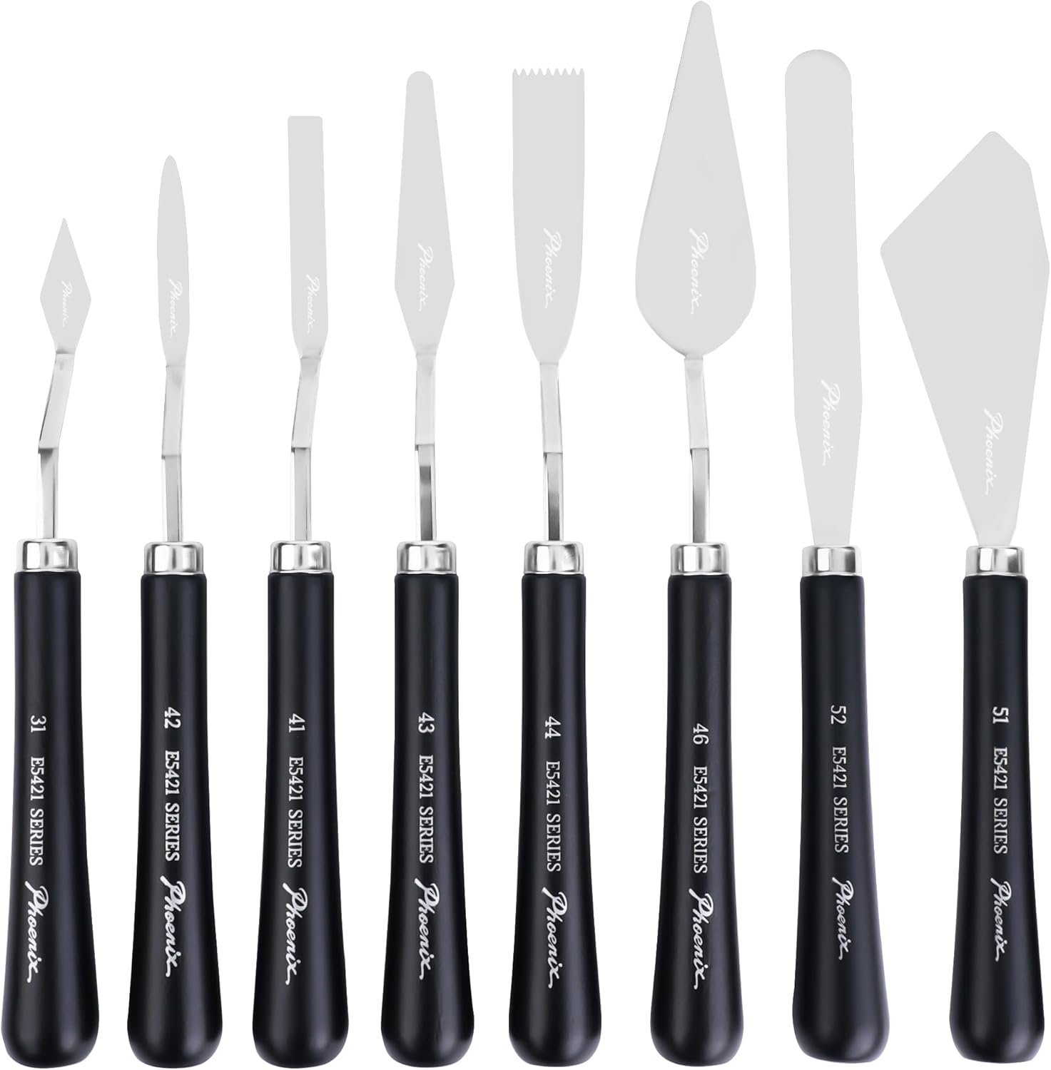 PHOENIX High Flexible Palette Knife Set, 8 Pieces Stainless Steel Painting Knives (31,41,42,43,44,46,51,52) Art Knife with Wood Handle, Paint Spatula for Oil Acrylic Paint