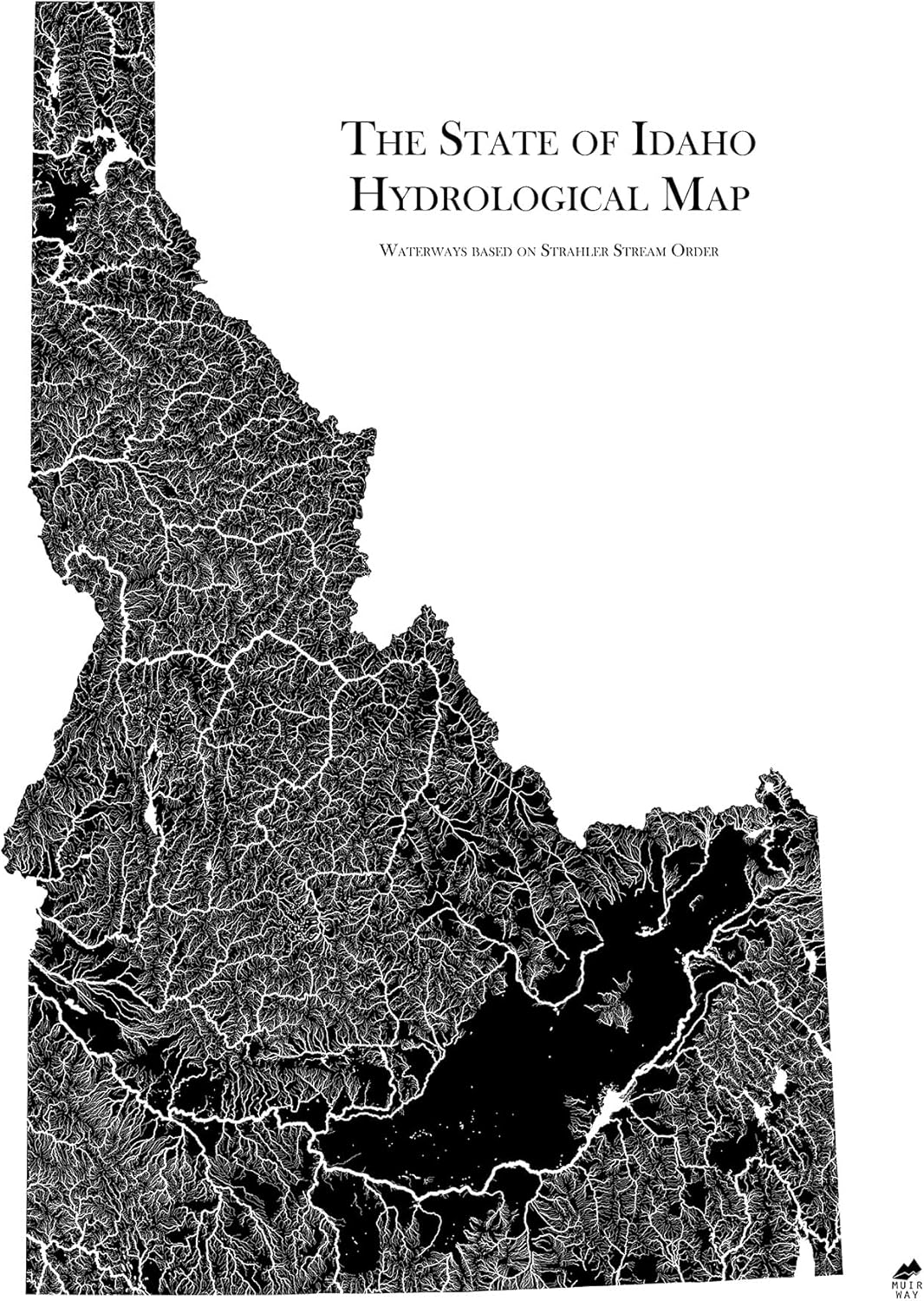 Muir Way Hydrological River Map of Idaho - Watershed Topographic Wall Art for Home, Office, or Travel Decor - Unframed Flat Paper Print, 24x30