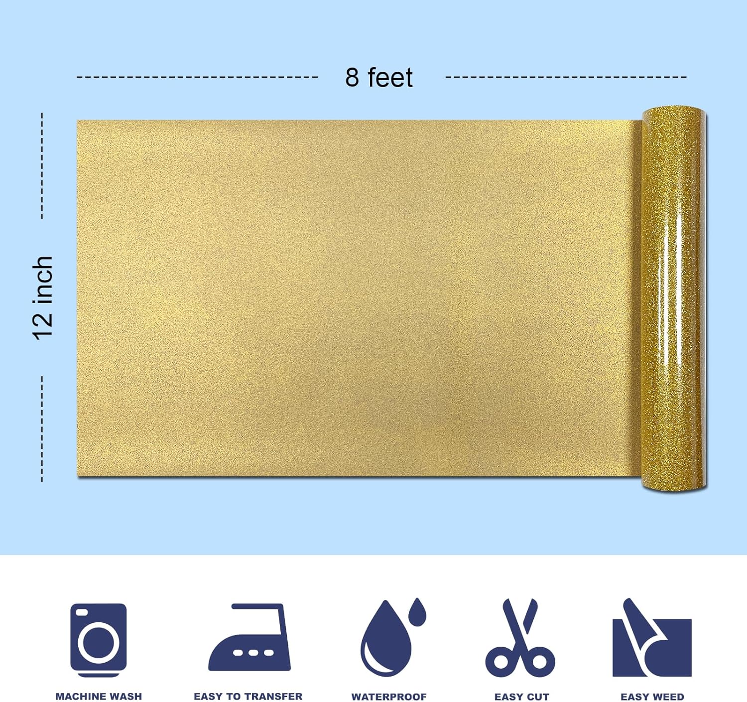 Golden Glitter HTV Heat Transfer Vinyl, 12" x 8ft lron on Vinyl, for T-Shirt Ironing, Vinyl HTV Easy to Cut and Weed, The Best Choice for DIY Creativity. (Golden, 12" x 8ft)
