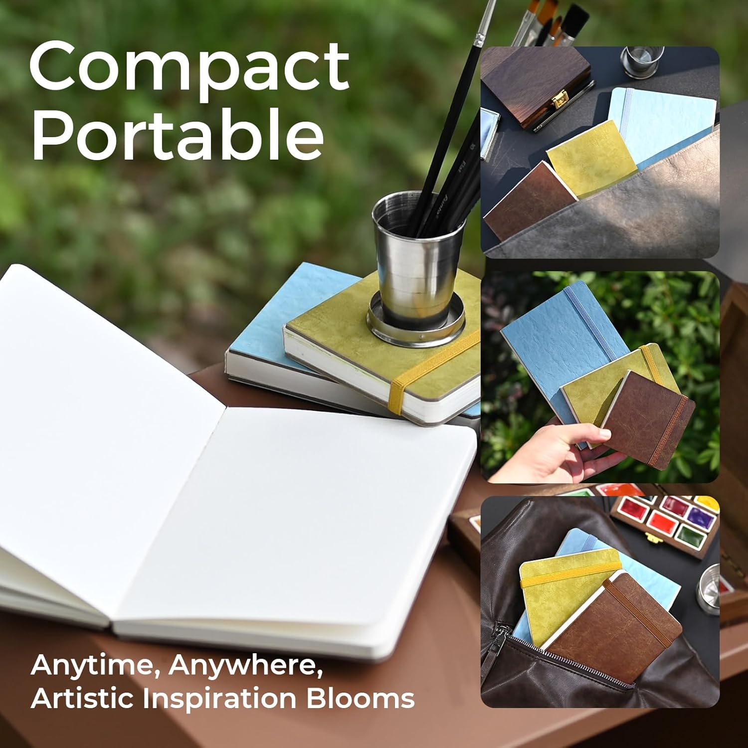 Funto Watercolor Journal, 7.5x5, 2 Packs, 44 Pages Each, Cold-Pressed 100% Cotton, Pearlescent PU Leather Brown Cover, Art Supplies for Mixed Media
