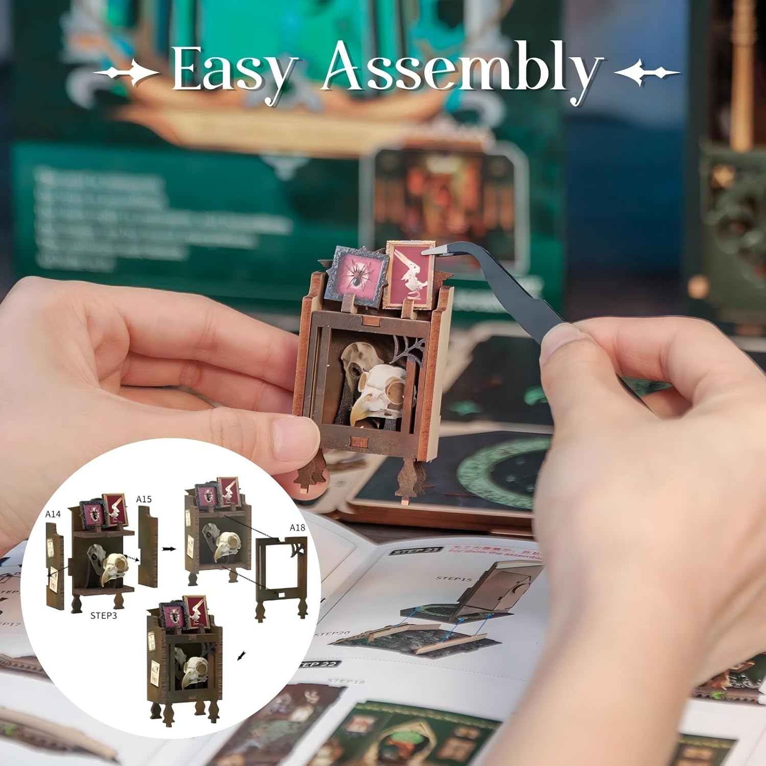 - 【Unique Designed Book Nook Kit - The Darkness Herbarium】The book nook is made of wood, all the wooden pieces were lasered cut and easy to remove, the pieces are pre- colored and there is an instruction to follow when you set up
