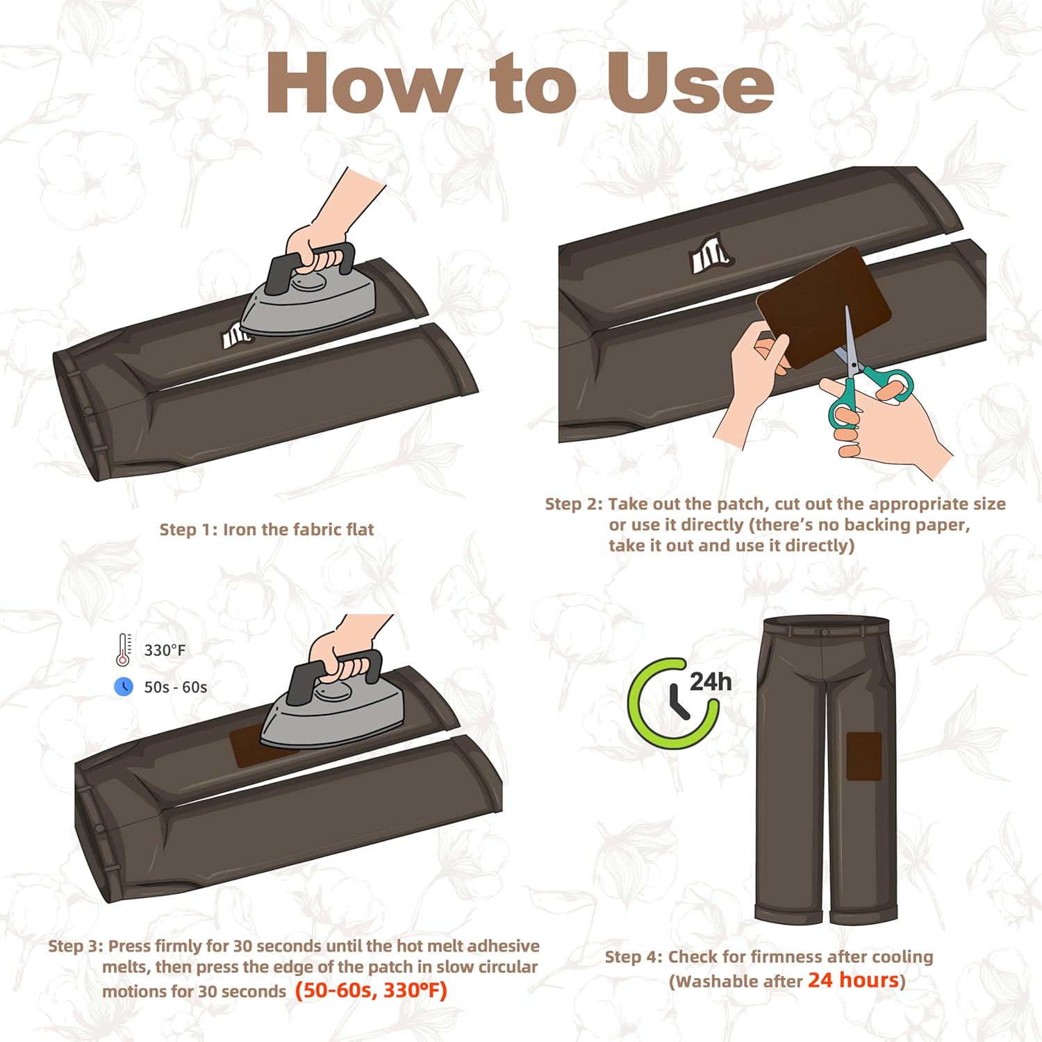 - Easy to use: Use scissors to cut out the size or shape you need to repair. Place the patch in the area you need to repair, then press the fabric patch with an iron and heat it about 1 minutes. Simple repair to make the fabric patch firm and free of residue.