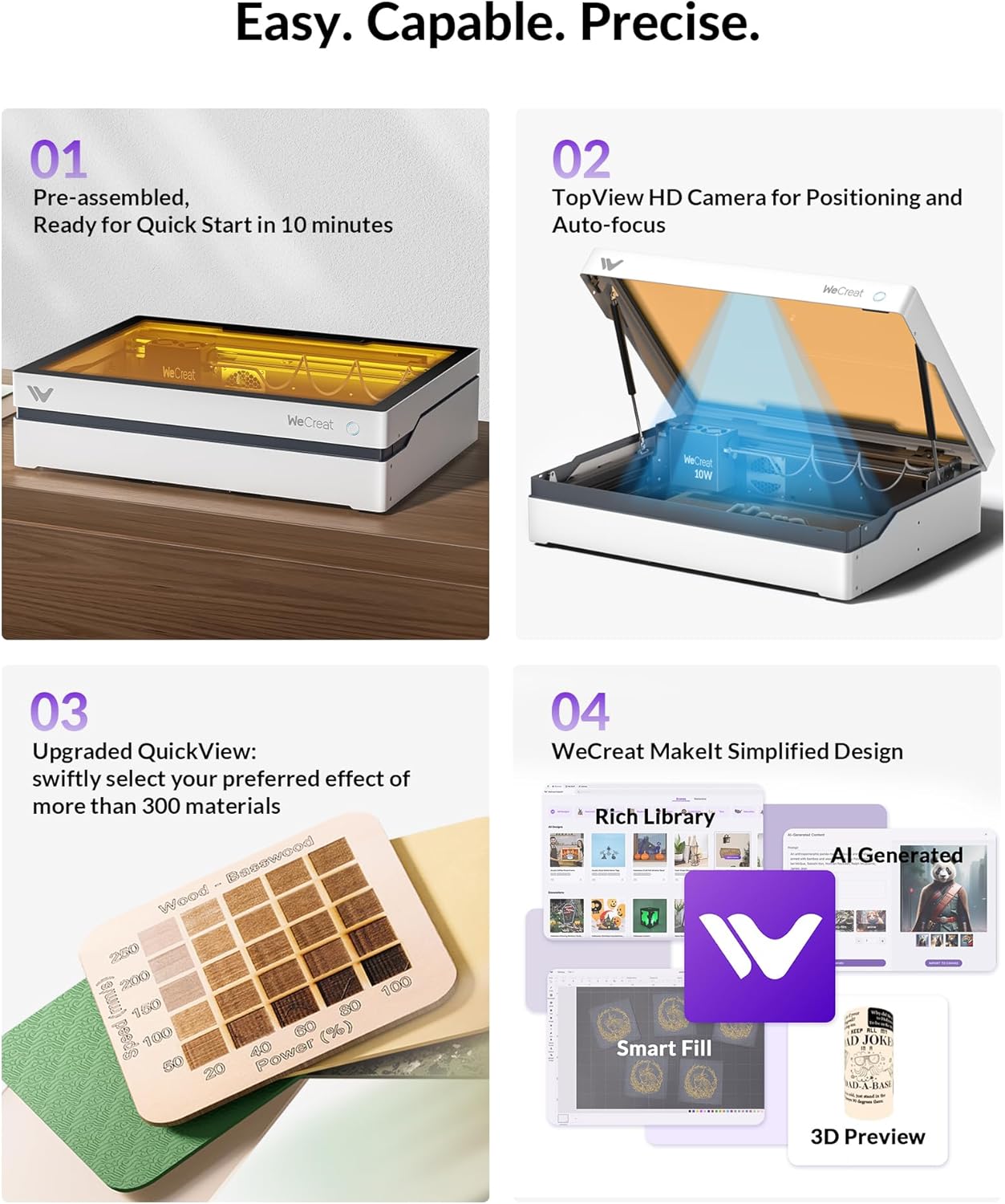 - [WeCreat MakeIt's New Look & Extensive Library]—Experience the best of both worlds – full compatibility with LightBurn plus an updated WeCreat MakeIt library packed with over 2000+ design projects, 500+ typefaces, thousands of SVG images, and weekly new additions. From Valentine's Day to weddings, Halloween to Christmas, the only limit is your imagination. Create custom gifts, earrings, art pieces, or even architectural designs – the Vista is your ticket to endless creativity.