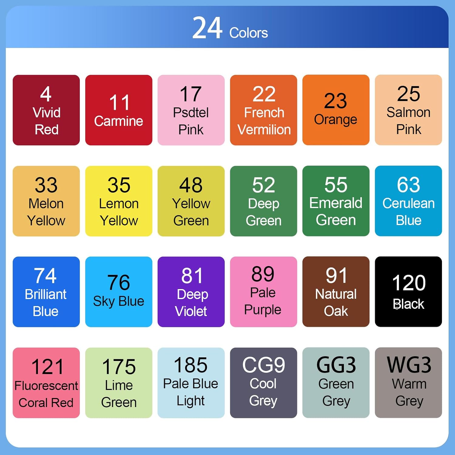 - 【24 VIBRANT COLORS】24 colors unique art marker pens bring your art to life, multiple choices, standard colors on the pen, new color system, no deviation, natural transition, natural color overlap, outstanding effect, bright color, easy to blend. Whether it's a coloring book or a masterpiece in the making, your artwork is sure to shine with these brush markers. Great as art markers, sketch markers, permanent markers, alcohol based markers, paint markers.