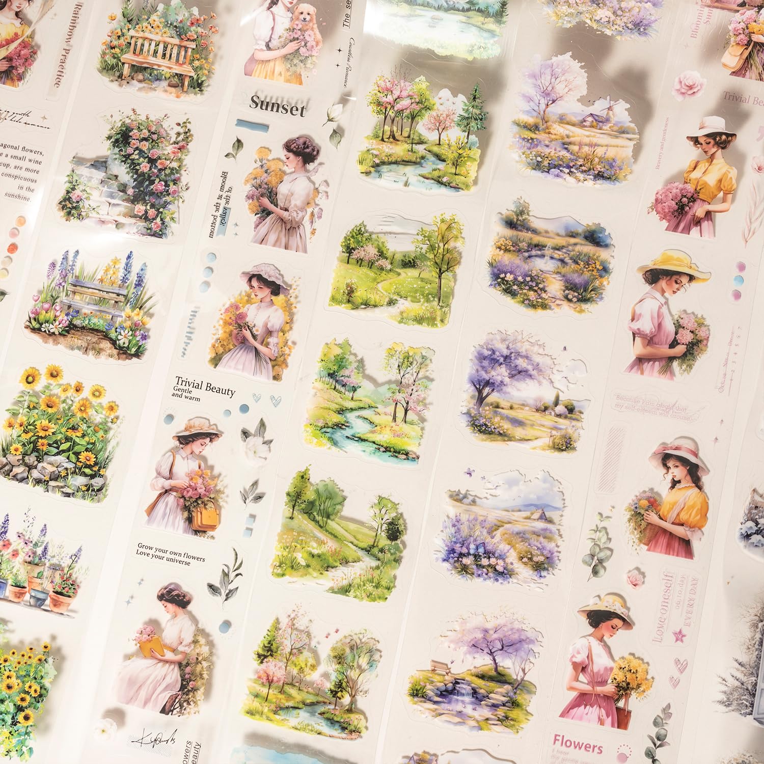 - Beautiful Scenic and Floral Designs: This set includes 4 pre-cut PET tapes featuring vibrant floral gardens and elegant girl portraits, making them ideal for adding a creative and colorful touch to scrapbooks, journals, and various DIY craft projects