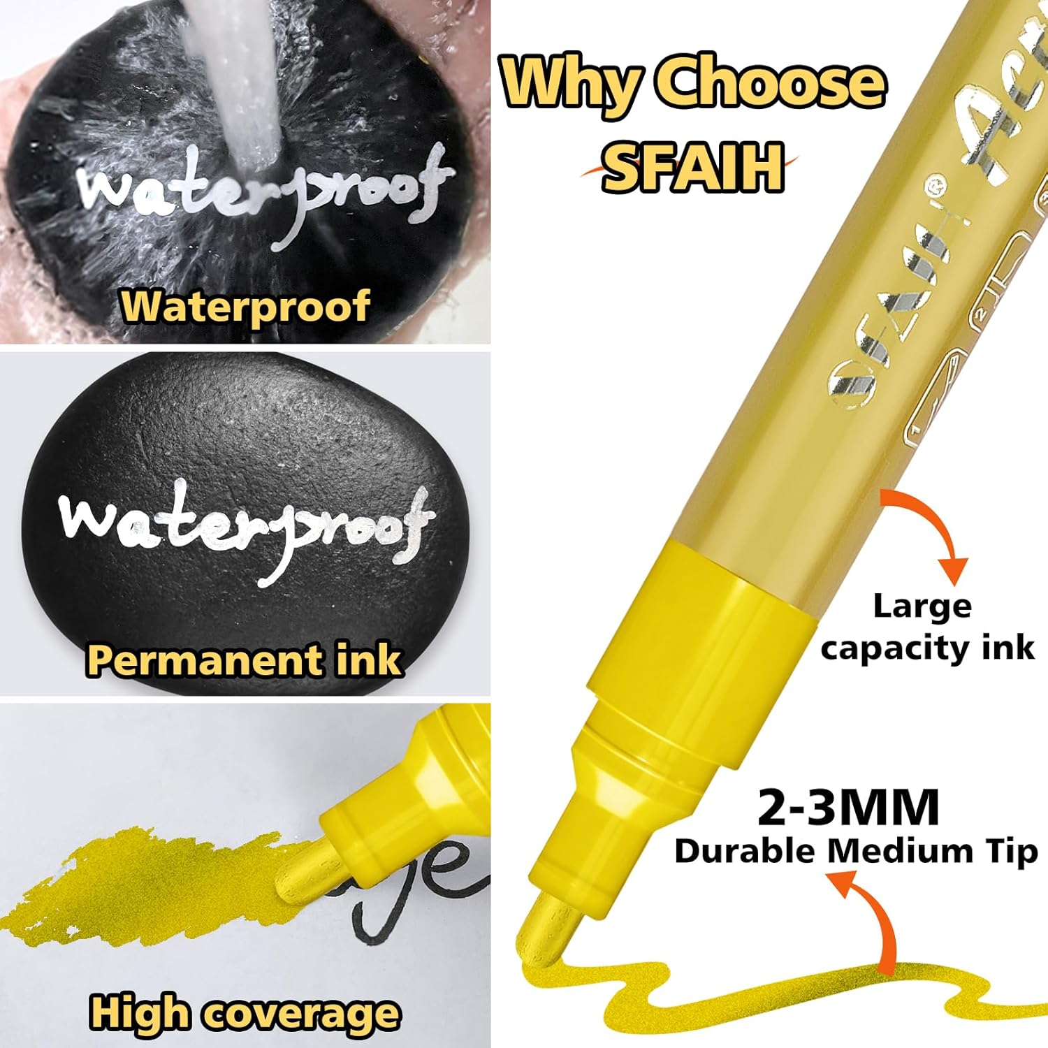 - FOUR COLORS - MINIMALIST LUXURY: SFAIH acrylic paint markers offer a 4-color, 8-pack set. featuring pure white, classic black, luxurious gold, and shimmering silver—a perfect color combination. The bold contrast of black and white, paired with dazzling metallic markers, makes every stroke radiate artistic charm, adding unique brilliance to your creative projects.