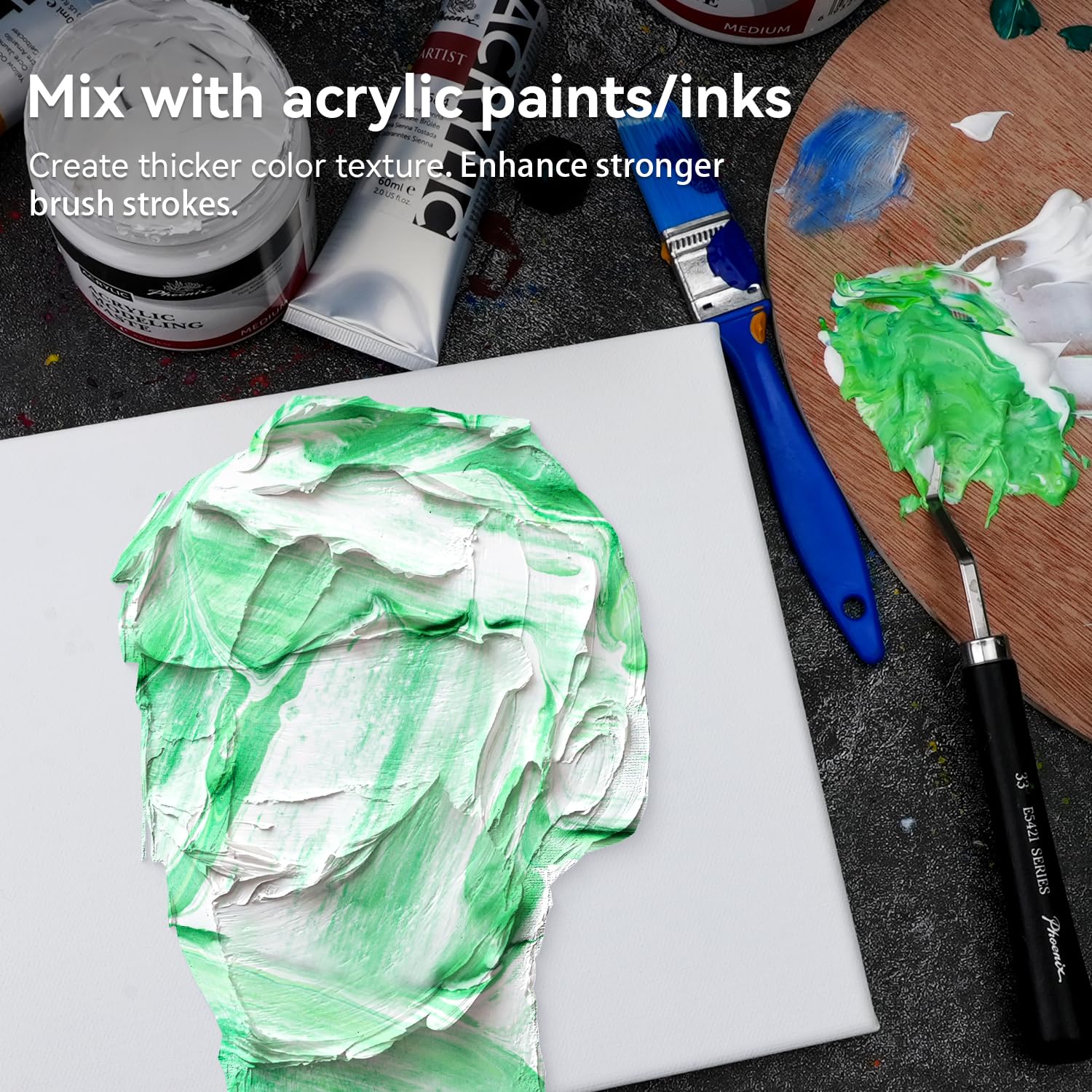 - Versatile Application: Use PHOENIX modeling paste to create a variety of textures, from fine lines and intricate details to bold, chunky designs. Perfect for use on canvas, wood, metal, and other surfaces. It's a must-have for artists working in many mediums. Mix the texture paste with acrylic paints to achieve individual shades.