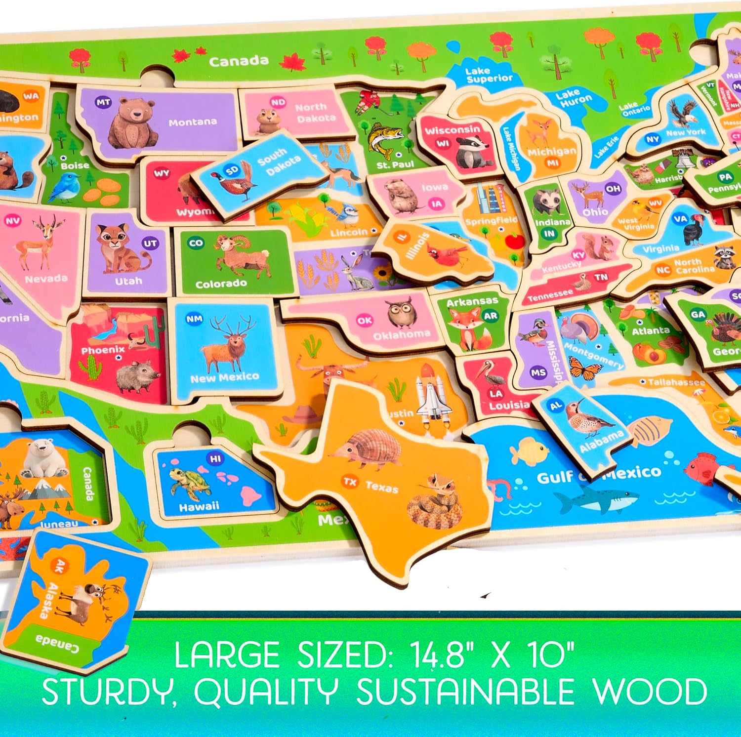 Montessori Mama USA Map Wooden Puzzle, Puzzles for Kids Ages 4-6 Educational Toys for 4 Year Old Kids Puzzles Ages 5-8 Landmarks, Animals, Capitols and States