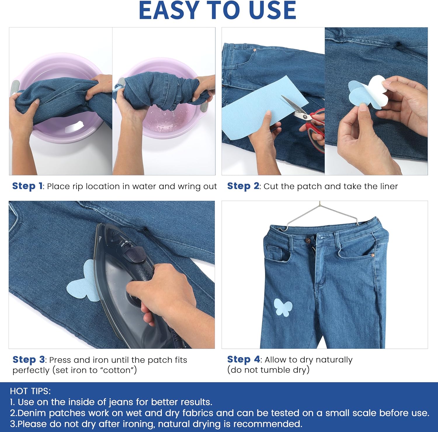 - HOW TO USE:1. Place jeans in water, then remove and wring out.2. Determine the size of the tear and cut the denim patch.3. Press and iron the patch until the edges fit perfectly (Iron temperature is set to βCottonβ). The patches have been tested to be both strong and soft after ironing on a damp cloth.