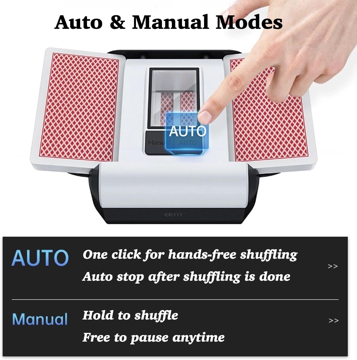 - More Poker Games: Automatic card shuffler can shuffle 1 or 2 decks, upgraded with retractable tail wing to accommodate cards of various sizes, suitable for UNO, Texas Holdโem, Blackjack, Bridge, Skip Bo, Phase 10, Mahjong, and more