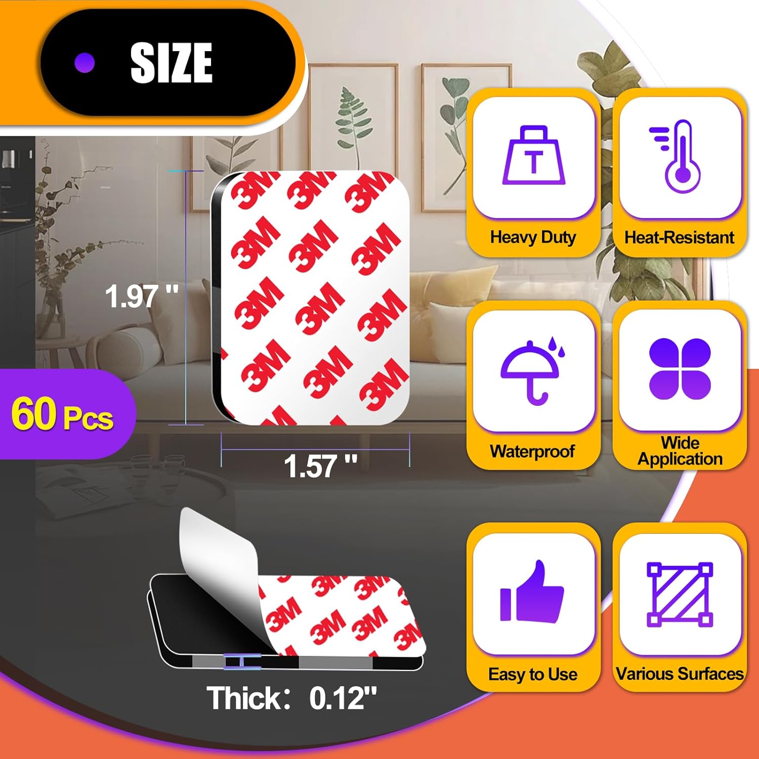 60 Pcs Strong Double Sided Adhesive Pads, Made of 3M, Heavy Duty Square Sticky Mounting Foam Tape for Car Décor Wall, 0.12" Thick Black Sticky Pads 1.57x 1.97
