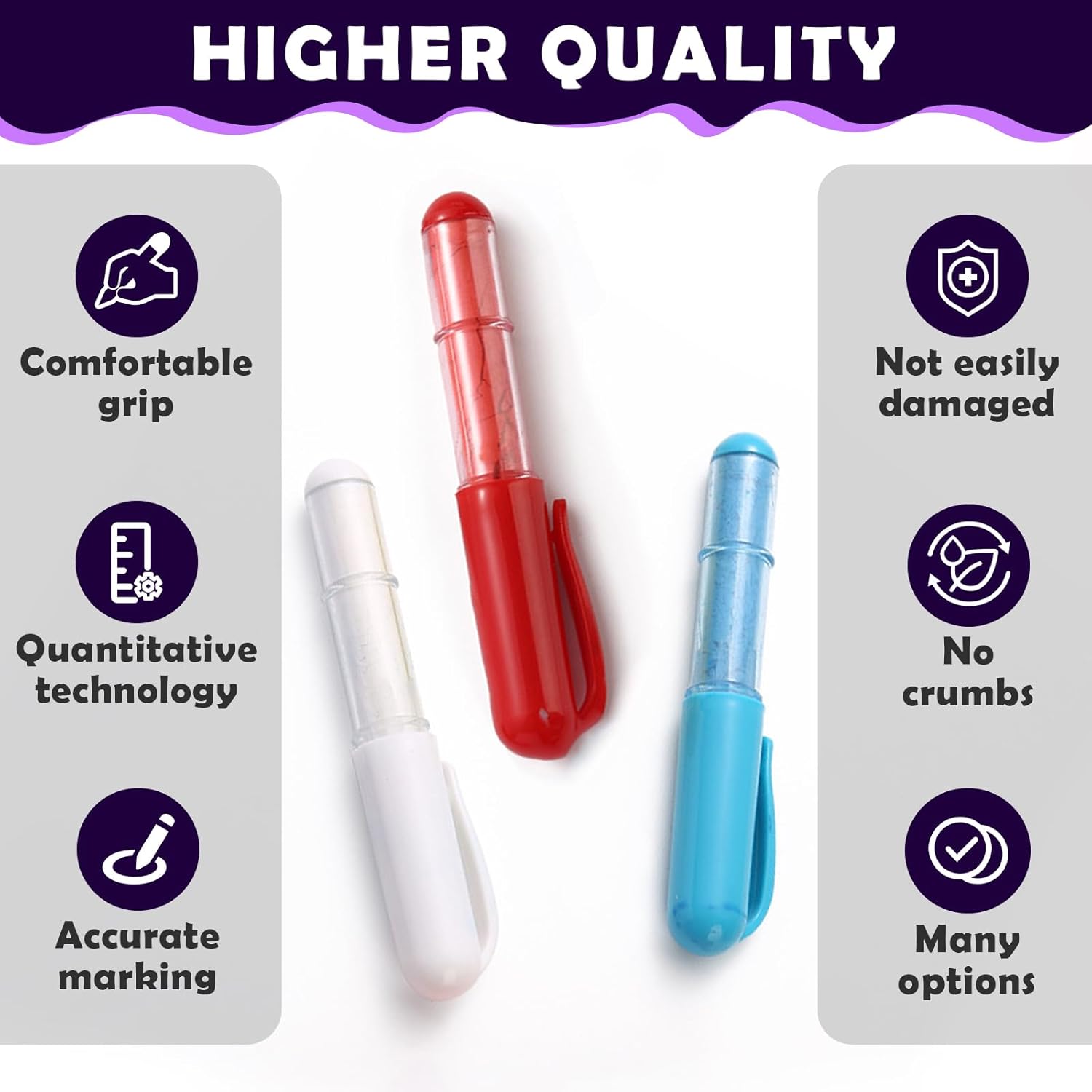 - Chalk Stays Put: Ordinary Chalk is Usually Fragile. This can lead to inaccurate marking lines and errors, increasing our sewing workload. But our fabric chalk markers for sewing staysstay within the fabric pen. Chalk pencils for sewing no random breakage sewingproviding us with more accurate markings.