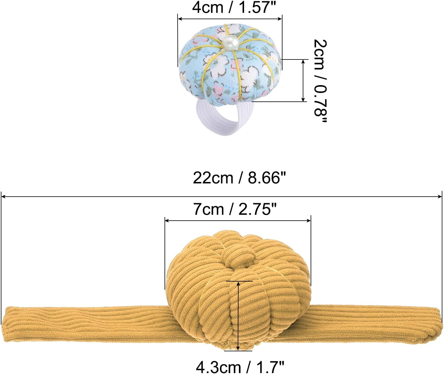 - Specification: Color: Yellow; Material: Corduroy Fabric; Overall Size: 8.5x1.8cm / 3.34x0.71" (L*OD); Package List: 1 x Wrist Pumpkin Pin Cushion, 1 x Ring Cushion