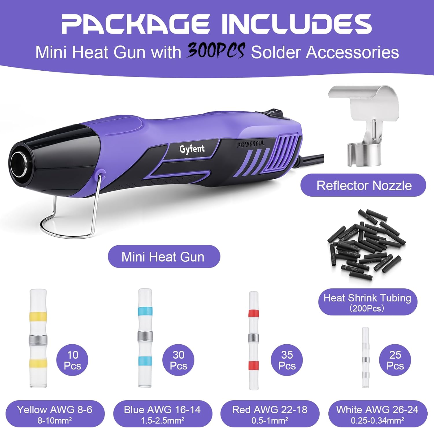 Gyfent Heat Gun with 100Pcs Solder Seal Wire Connectors & 200Pcs Heat Shrink Tubing, 662°F/752°F(350°C/400°C) 350W 2-Temp Mini Heat Gun with 5Ft Power Cord for Crafting Shrink Tubing Embossing DIY