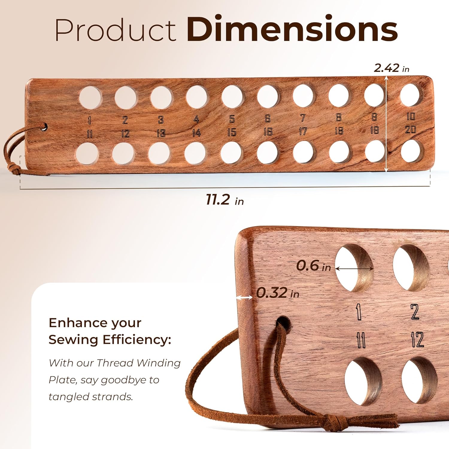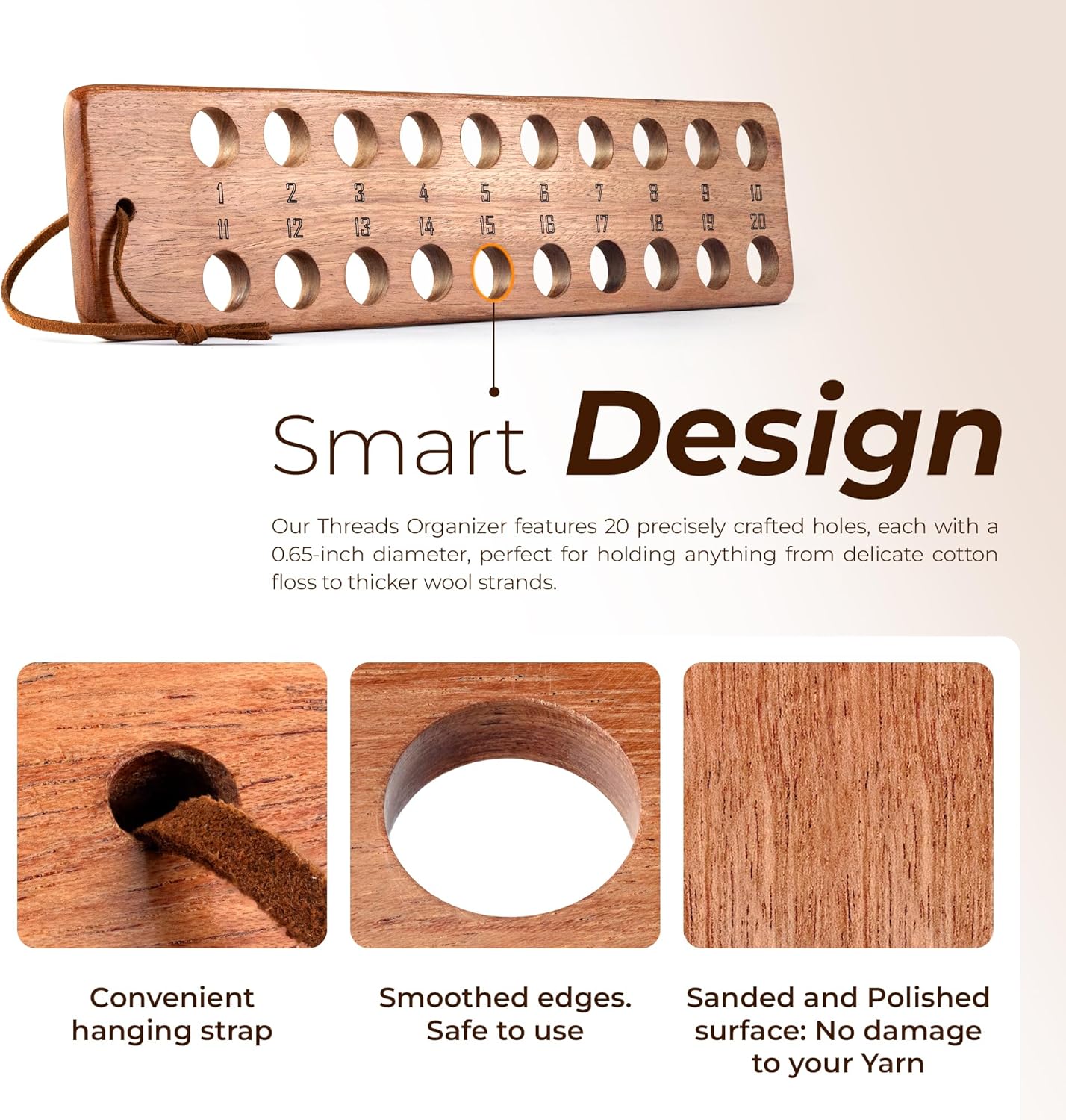 - Smart Design: Our Threads Organizer features 20 precisely crafted holes, each with a 0.65-inch diameter, perfect for holding anything from delicate cotton floss to thicker wool strands.