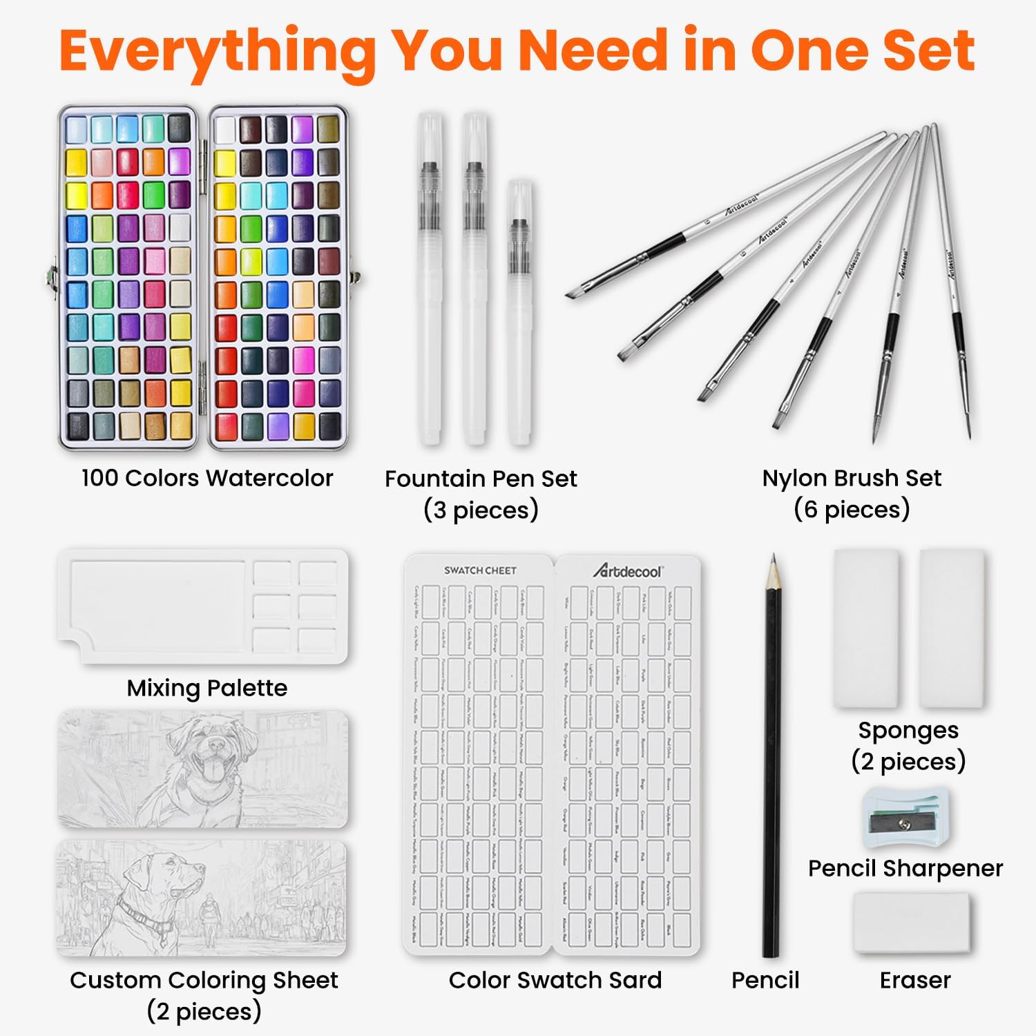 - | Suitable for Creators of All Ages | - Artdecool 100 Colors Watercolor Paint Set includes 100 watercolor paints, 6 professional brushes in various sizes, 3 water brush pens, a palette, watercolor paper, a drawing pencil, an eraser, a color card, 2 coloring cards, a pencil sharpener, and 2 sponges. Everything you need in one set of drawing art supplies, designed for artists, amateur hobbyists, and painting lovers, making it an ideal gift for both beginners and professionals of all ages and levels