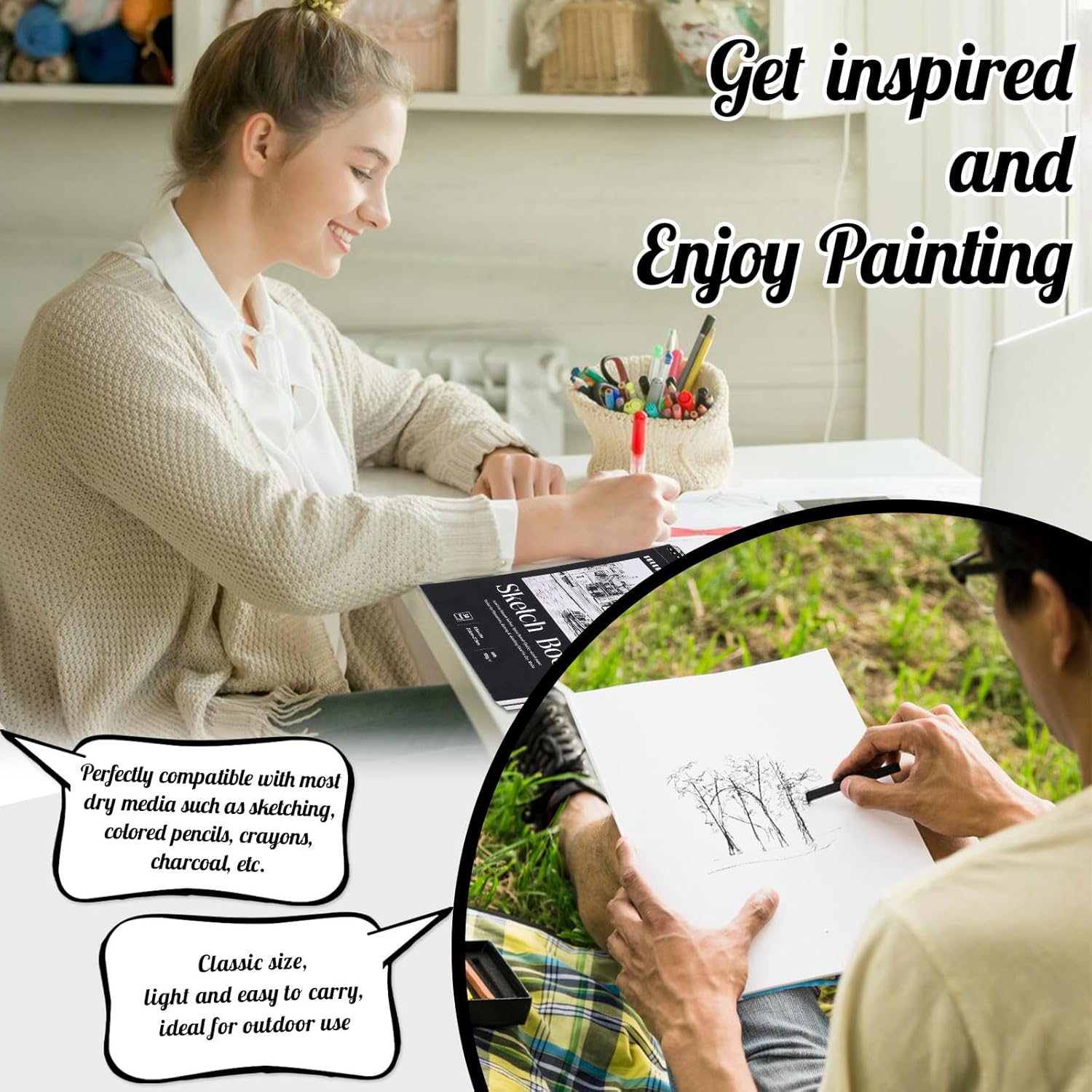 - 【Ready-to-use Studio Features】Reinforced hard cover backing replaces bulky drawing tables. Matte laminated sketchbook stands up to the wear and tear of travel - perfect for outdoor drawing, urban sketching or classroom assignments