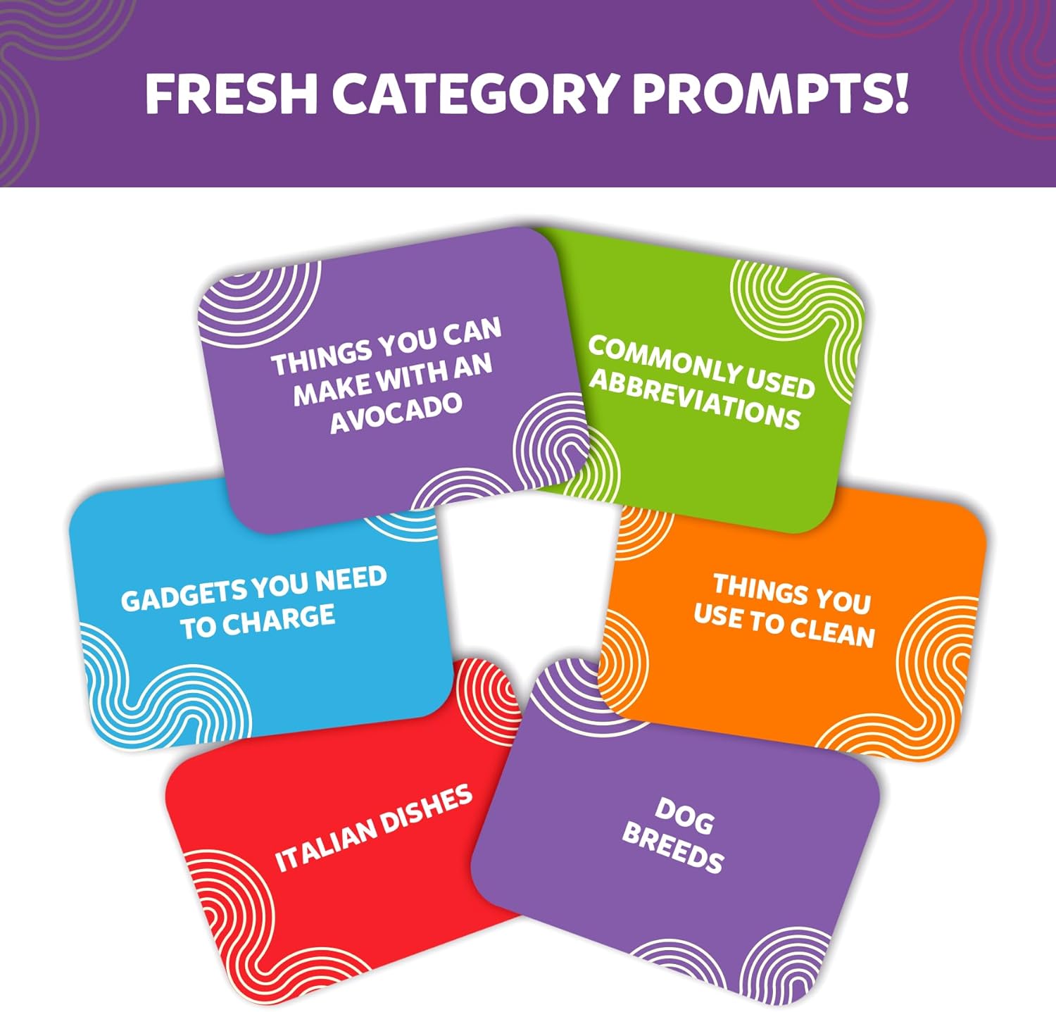 - INCLUDES: 200 Category Cards, 30 Letter Cards, 8 Pens, 1 Notepad, and an Instruction Manual.