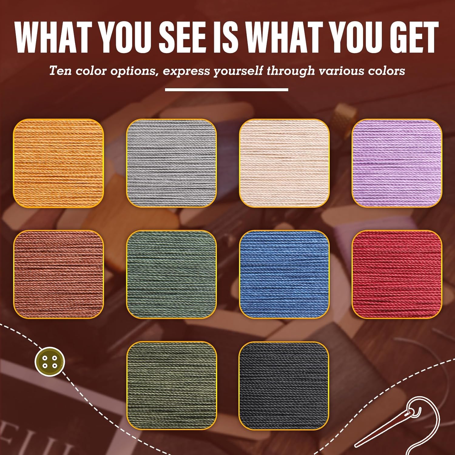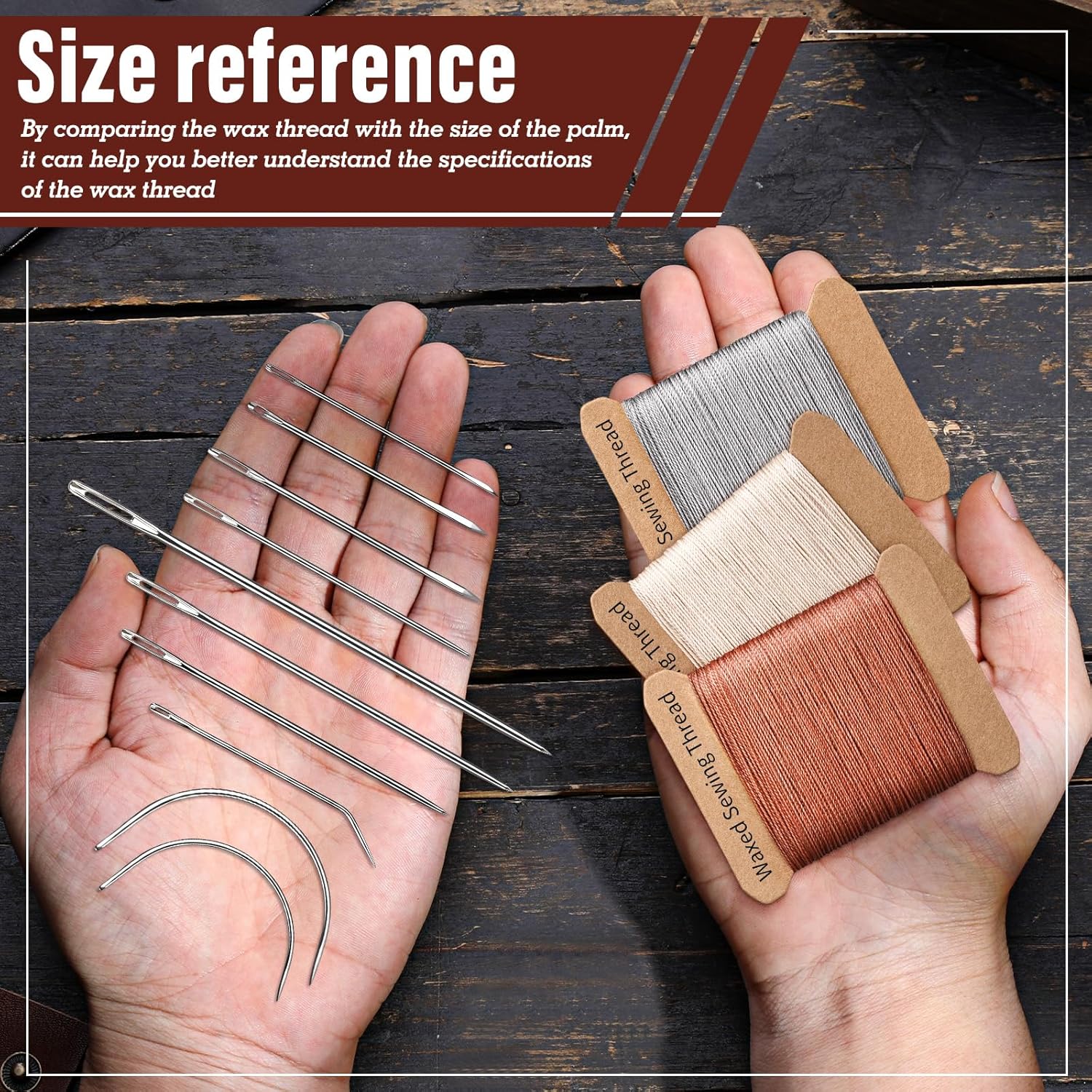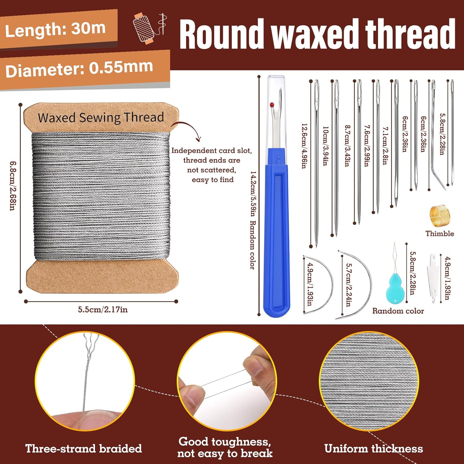 - Round Waxed Thread: Wax thread uses 3 strands of thread, make the thread stronger, waxed thread is not easy to unravel, preventing the stitches from coming loose and ensuring the longevity of the work, wax thread is evenly waxed, which can reduce friction during needle threading and sewing, and improve the smoothness of operation