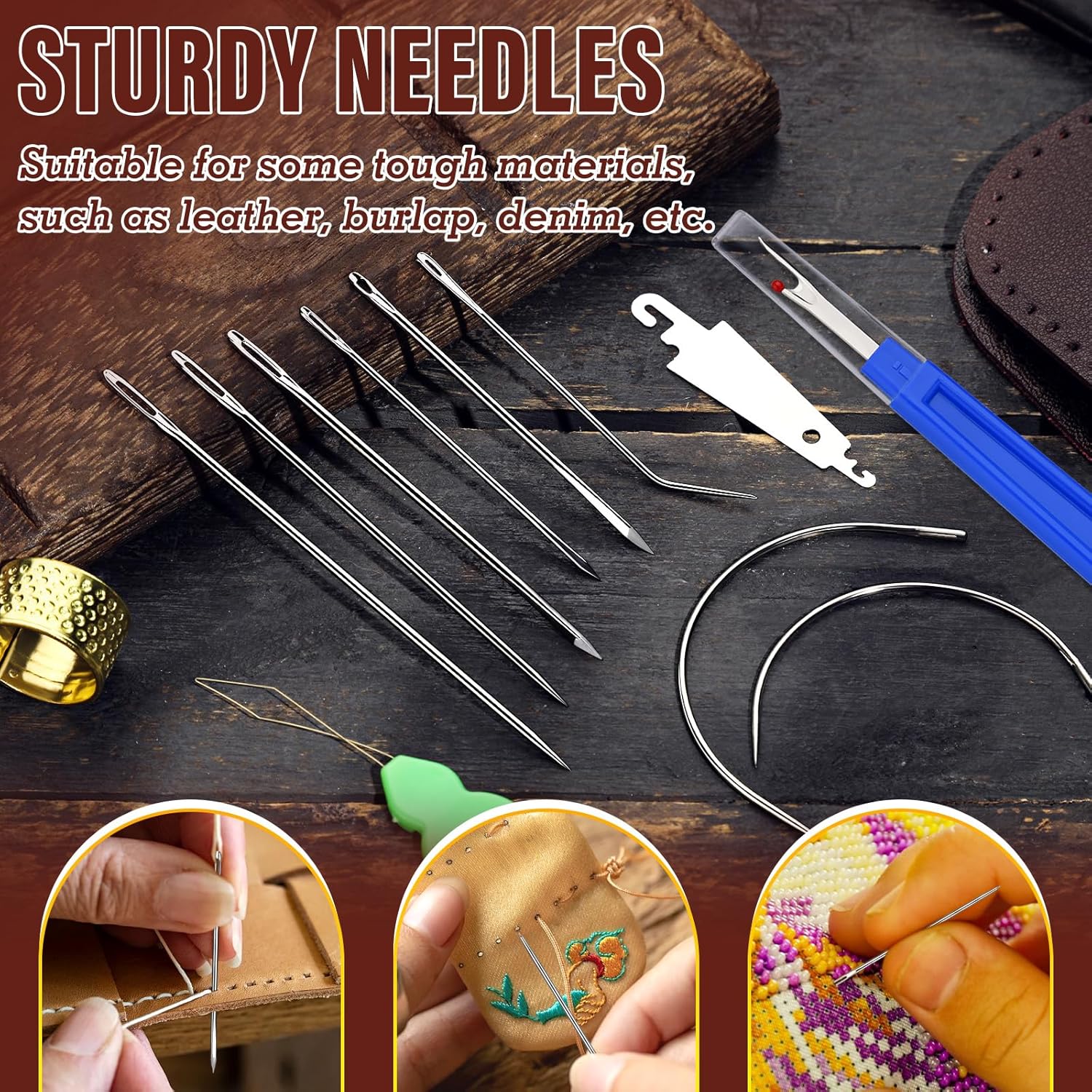 - Leather Needle and Waxed Thread Kit: Upholstery repair kit include 3 rolls 32 yards waxed threads and 8 heavy-duty needles (long upholstery needles, curved needles, j-shaped, triangle leather stitching needle, sail needle), thimbles, threaders, seam ripper. Useful for both beginners and professionals, sufficiently long wax thread and a sufficient number of needles can complete most leather projects