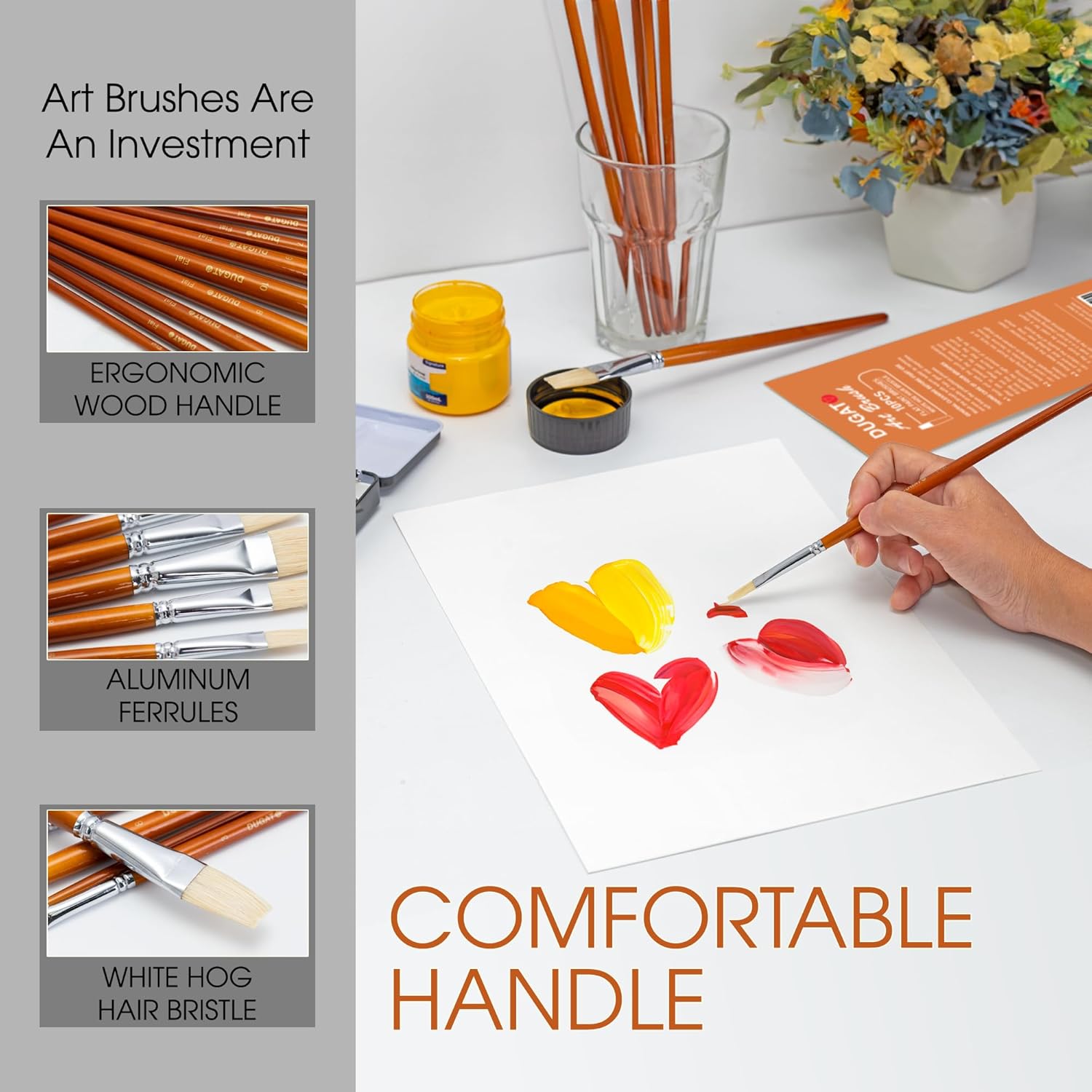 DUGATO 10pc Flat Hog Bristle Paint Brush Set - Short Handle Artist Brushes for Acrylic, Oil, Gouache, Watercolor - Canvas, Fabric & Craft Painting