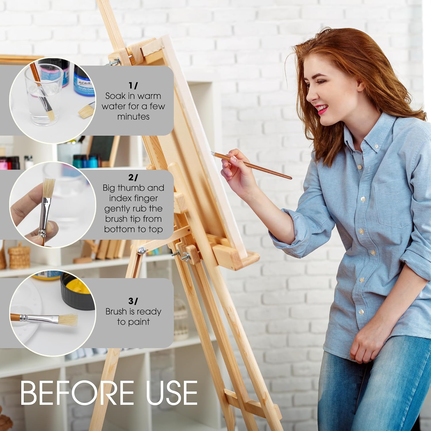 - Note: The paint brush set comes with a special coating on the bristles to help maintain their shape during shipping and storage. Before first use, wash the brushes thoroughly under warm, running water to remove the protective coating.