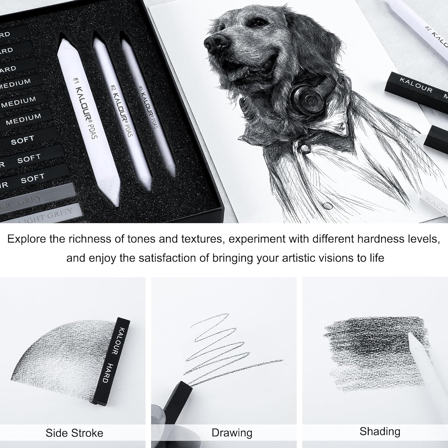 KALOUR 15 Pro Compressed Charcoal Drawing Set with Blending Stumps- Soft,Medium,Hard and White Charcoal - Charcoal Sticks for Drawing Sketching Shading - Art Supplies for Artists Beginners Adults