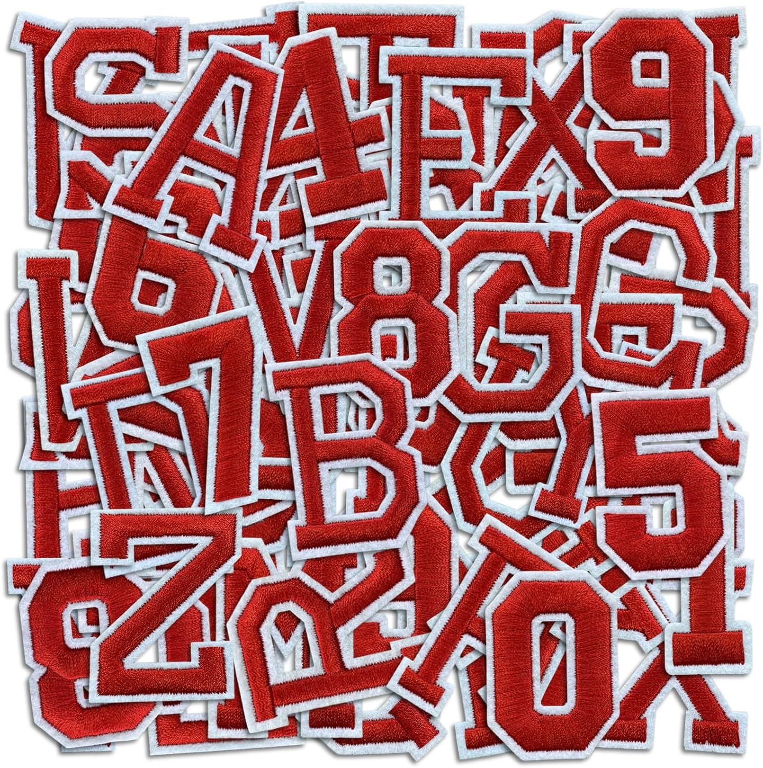 Letter and Number Iron On Patches, A-Z Alphabet and Numbers 0-9 Embroidery Applique Patch, DIY Decorative Heat Press Patches for Clothing Jeans Jackets Backpacks Hats (Red 72 Pcs)