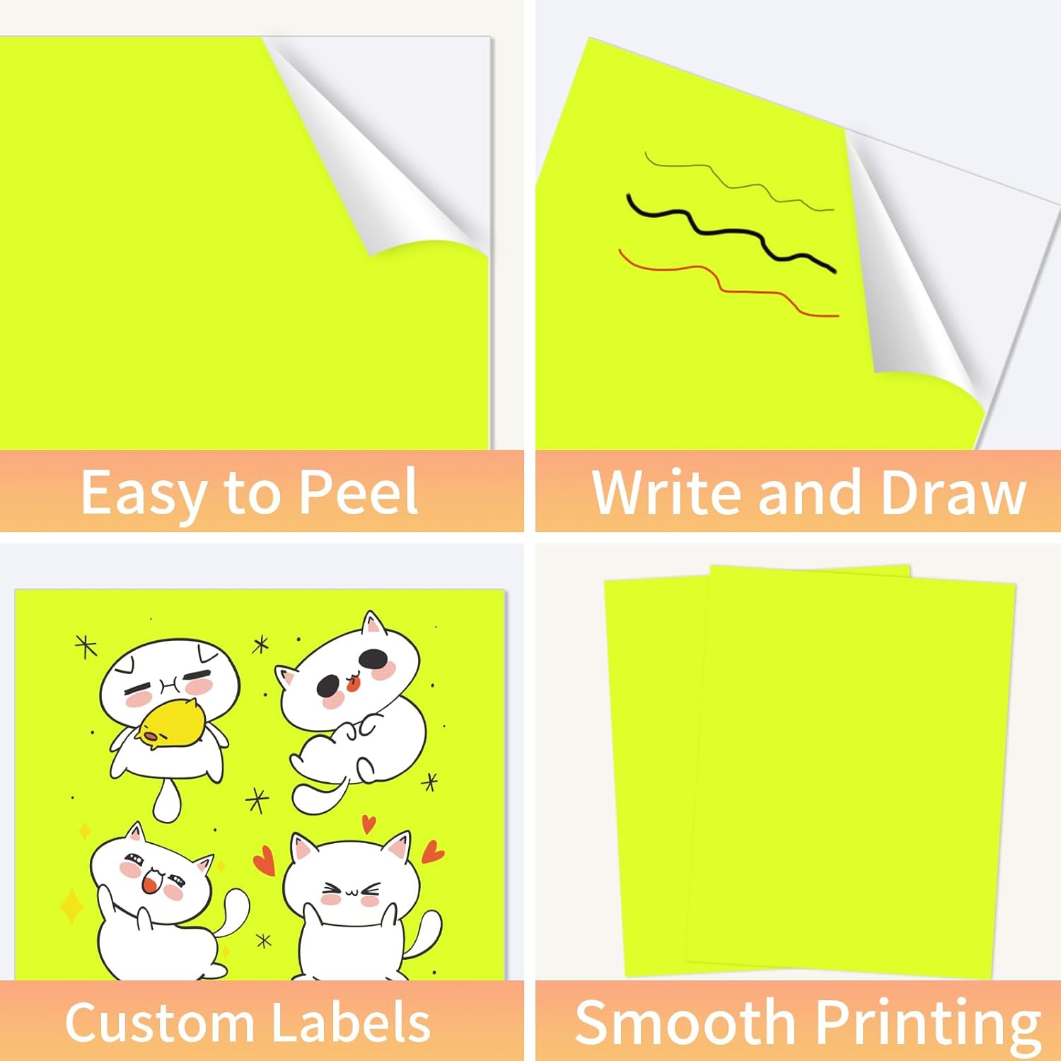 Neon Yellow Sticker Paper Labels for Laser & Inkjet Printer, Fluorescent Yellow Printable Sticker Paper- Matte, Letter Size 8.5" x 11"