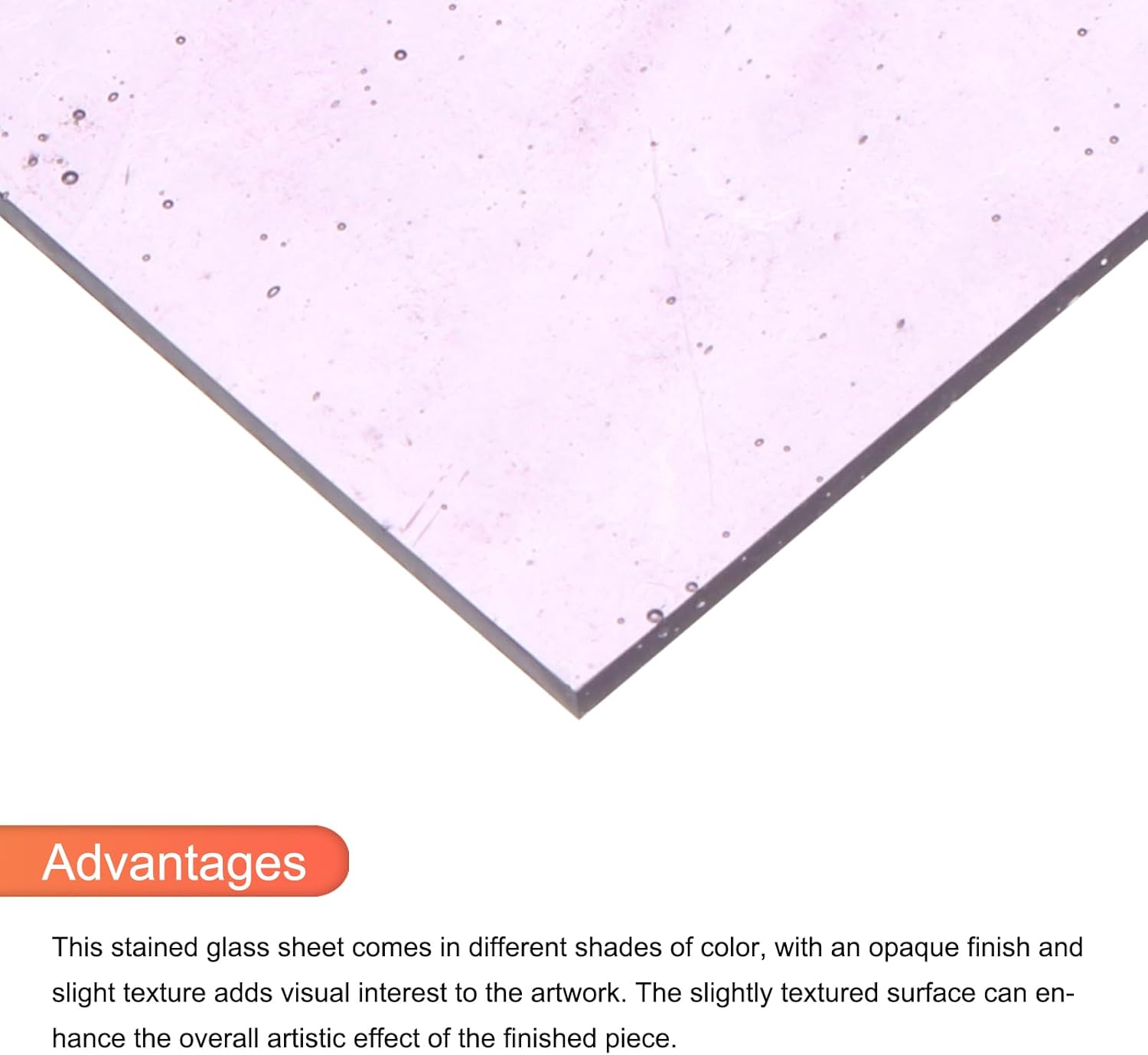 - This stained glass sheet comes in different shades of color, with an opaque finish and slight texture adds visual interest to the artwork. The slightly textured surface can enhance the overall artistic effect of the finished piece.
