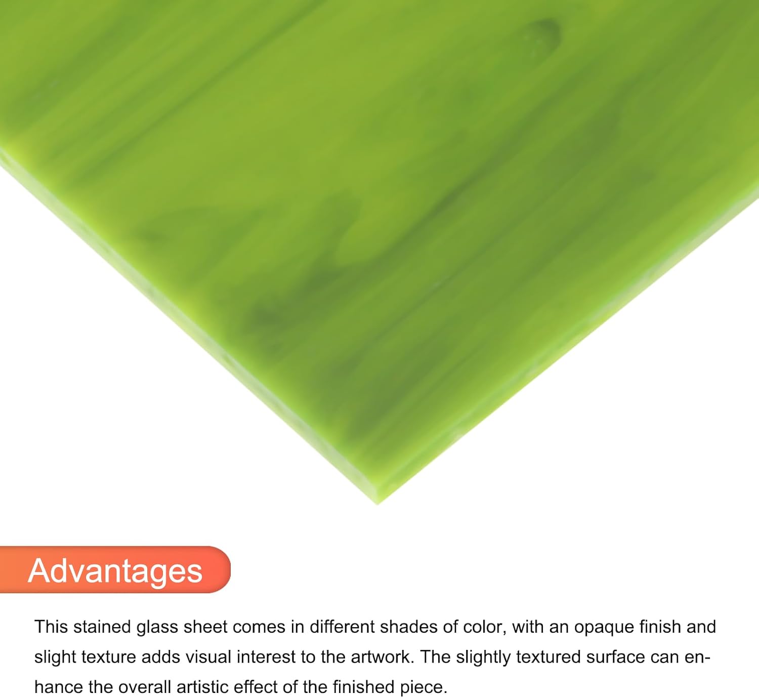 - Material: Glass; Color: Green; Size: 7.9 Inch x 5.9 Inch; Thickness: 1/10 Inch; In the package of: 2 Pcs x Stained glass sheet.
