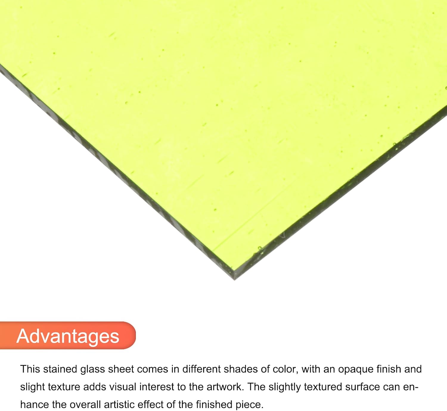 - Material: Glass; Color: Fluorescent Green; Size: 7.9 Inch x 5.9 Inch; Thickness: 1/10 Inch; In the package of: 2 Pcs x Stained glass sheet.