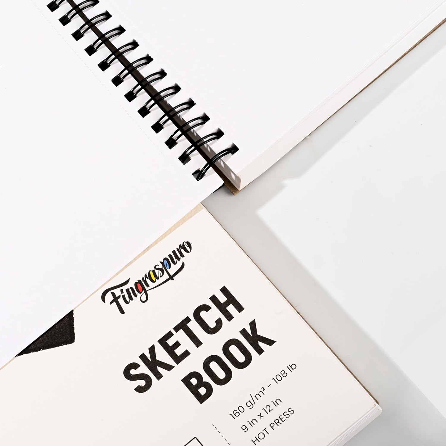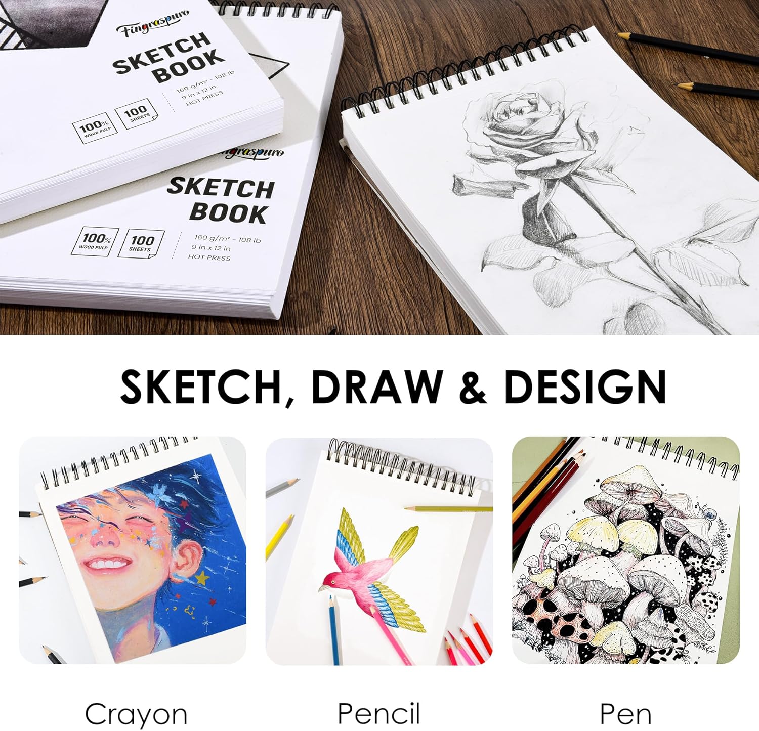 Fingraspuro 9"x12" Sketch Book, 100 Sheets, 108lb/160gsm, Top Spiral Bound Sketch Pad, Art Supplies, Sketchbook for Drawing, Acid-Free Hot Press Drawing Pad, Suitable for Various Art Tools