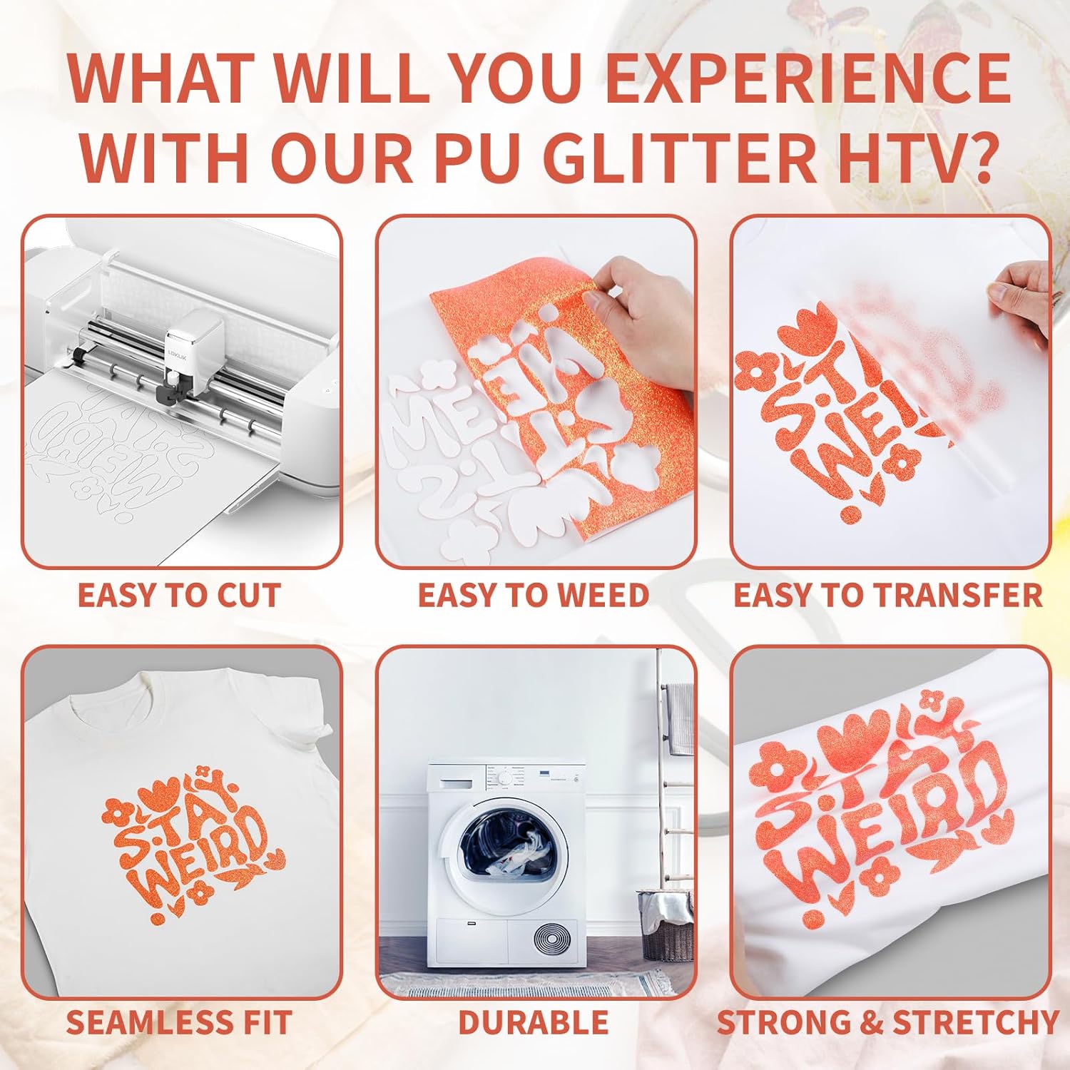 - 【EASY TO CUT WEED TRANSFER】The glitter htv is thick with an excellent cutting application characteristics, any cutters’ blade can cut it through easily. The medium tack transfer film makes weeding like a dream, the glitter heat transfer vinyl is extremely sensitive to heat and pressure makes transfer quickly, which you will save your time. The glitter iron on vinyl is sensitive to temperature and pressure, which can be heat transferred on any t-shirt easily