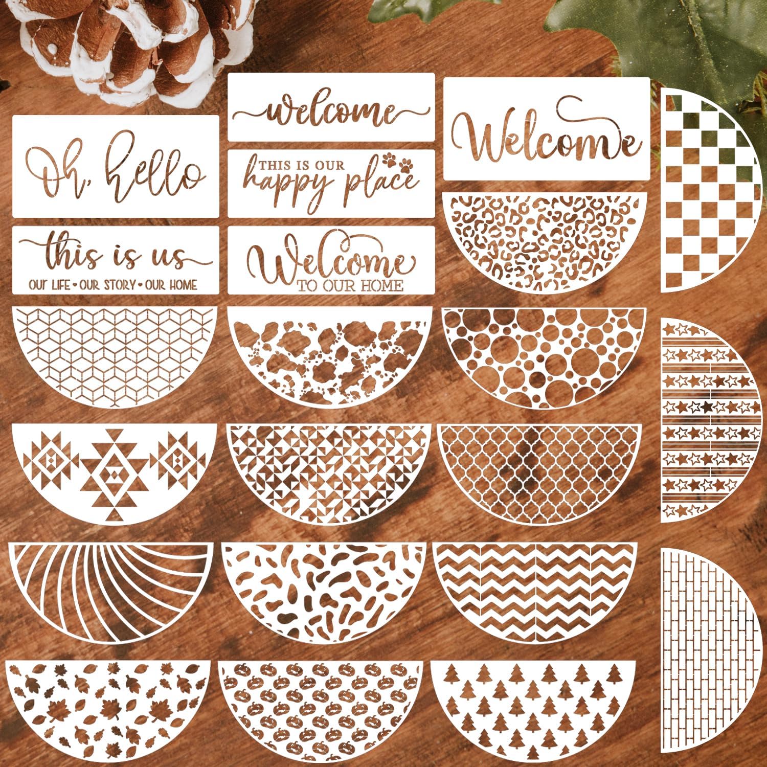 - Package Content:22pcs welcome stencils for wood sign, reusable welcome patterned stencils measure 11.8x6inch and 11.8x4inch.