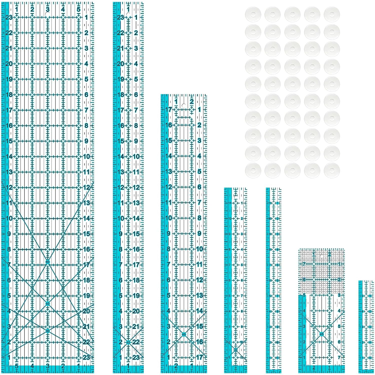Acrylic Ruler 7 Piece Set, Non Slip Rings 50 Pieces, Quilting Rulers, Size (6"x24"), (2"x24"), (3"x18"), (3"x8"), (1.5"x12"), (1"x12"), (1"x6") (Blue-7 Piece Set)