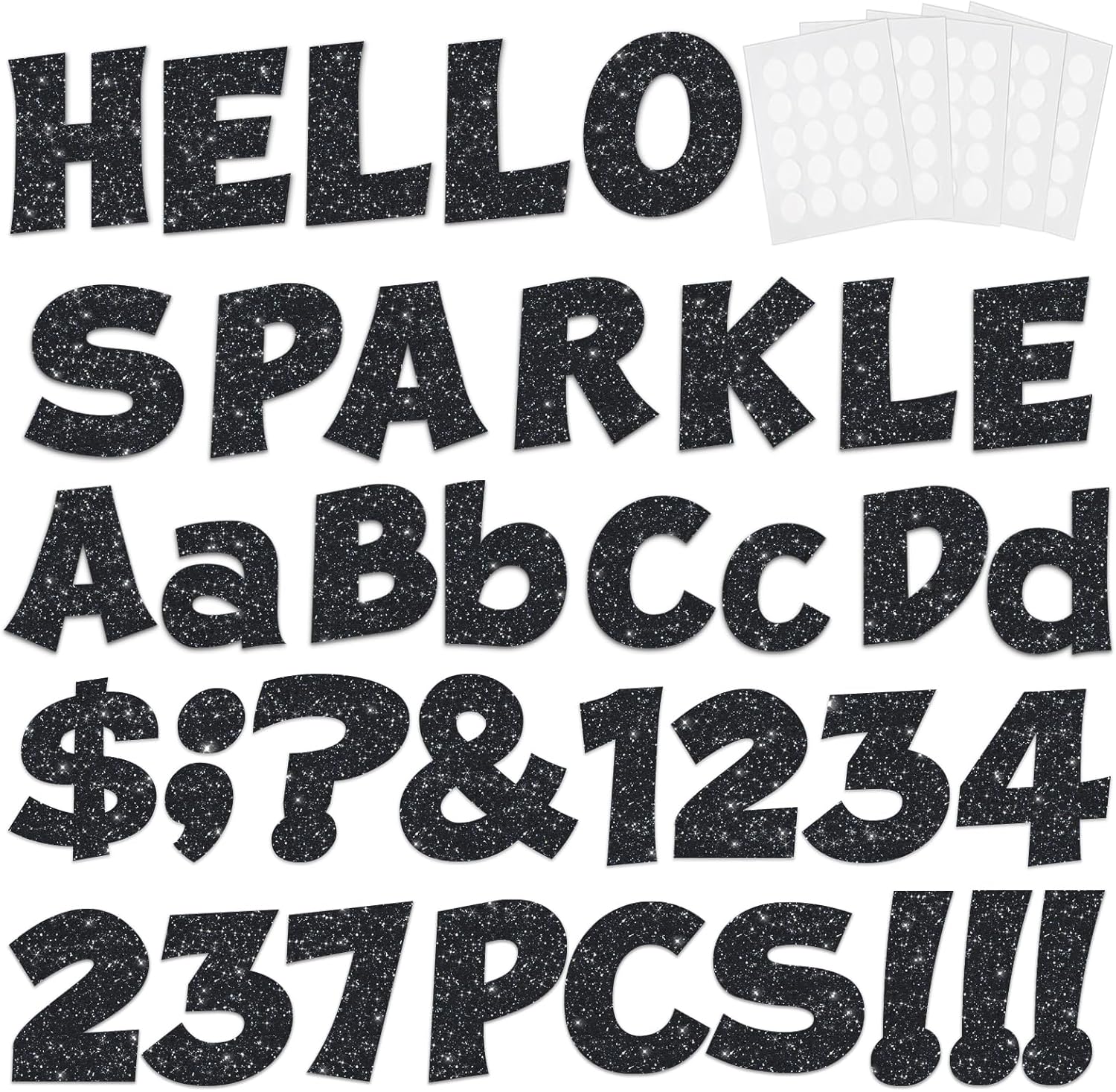 - Everything You Need - Get ready for crafting galore! With 237 pieces including capital letters, lowercase letters, numbers, and punctuation marks, you're all set for endless creative adventures. Plus, we've included 300 glue points to ensure you have more than enough to meet your daily crafting needs.