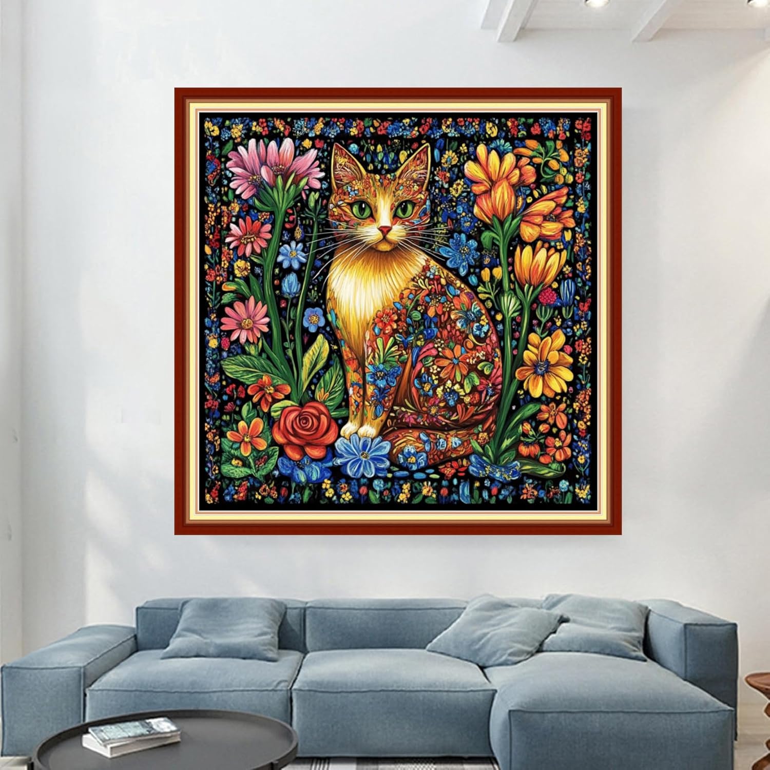Magxvouy Cross Stitch Kits Stamped Full Range of Embroidery Kits,Cross Stitch Patterns Needlework Kits for Beginners 11CT Printed Kits&Colorful Flower Cat 18x18 inch