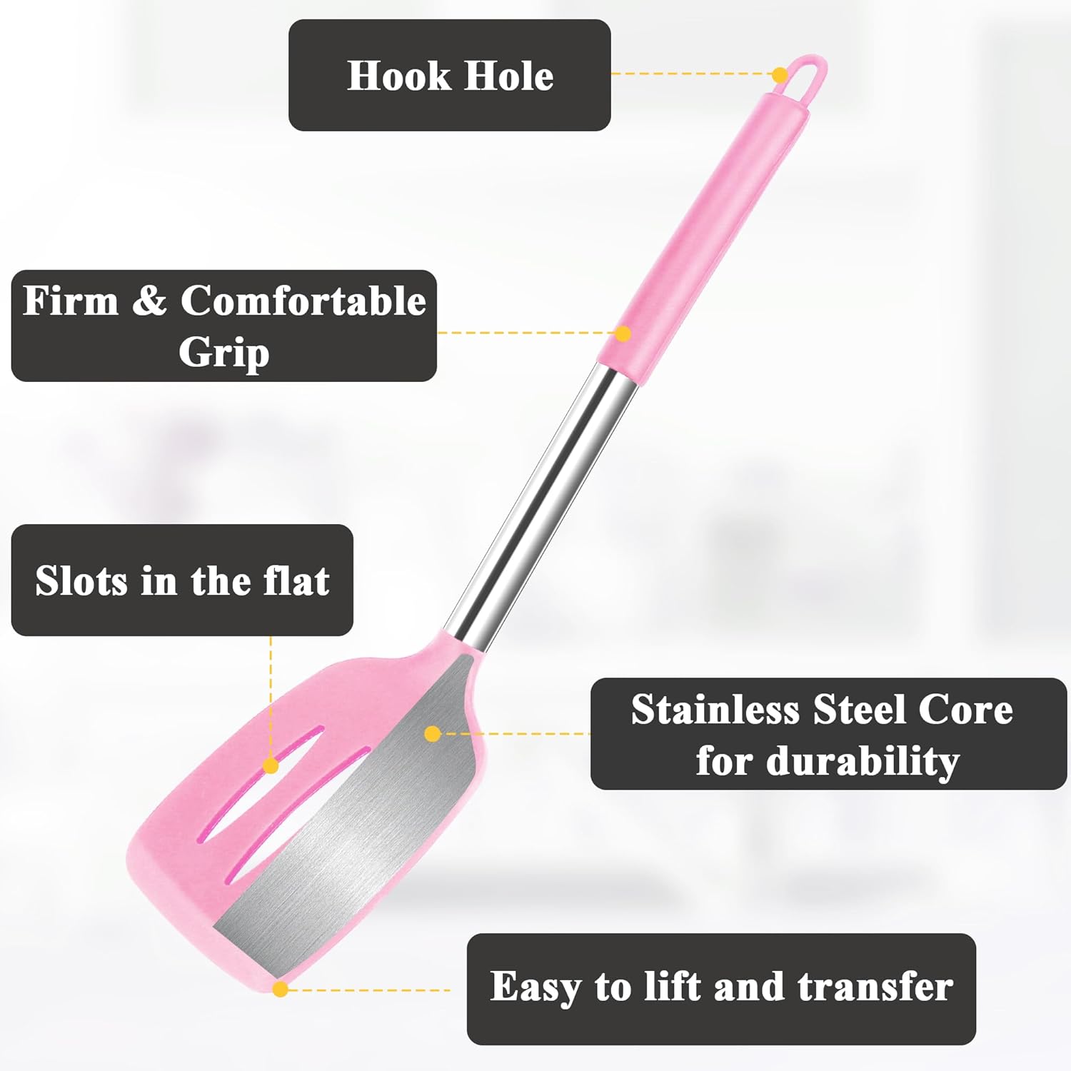 Silicone Spatula Spoon Set, 4 PCS Silicone Cooking Utensils Spatula Spoon Set with Stainless Steel Handle, BPA Free Kitchen Turners for Frying, Mixing, Serving, Draining, Turning, Stirring, Pink