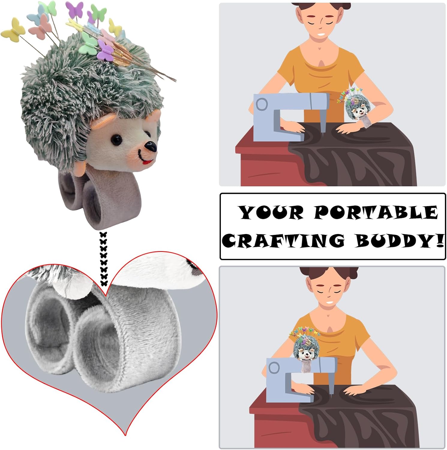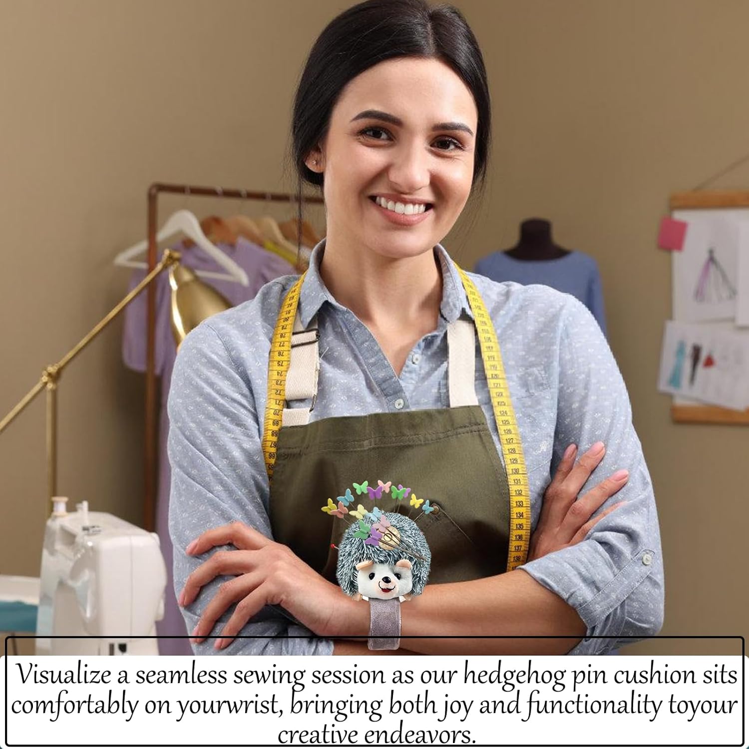 Cute Hedgehog Wrist Pin Cushion for Sewing with Magnetic, Snap Bracelet Wrist Bands for Pins and Needles Include 50 Lovely Butterfly Straight Pins.