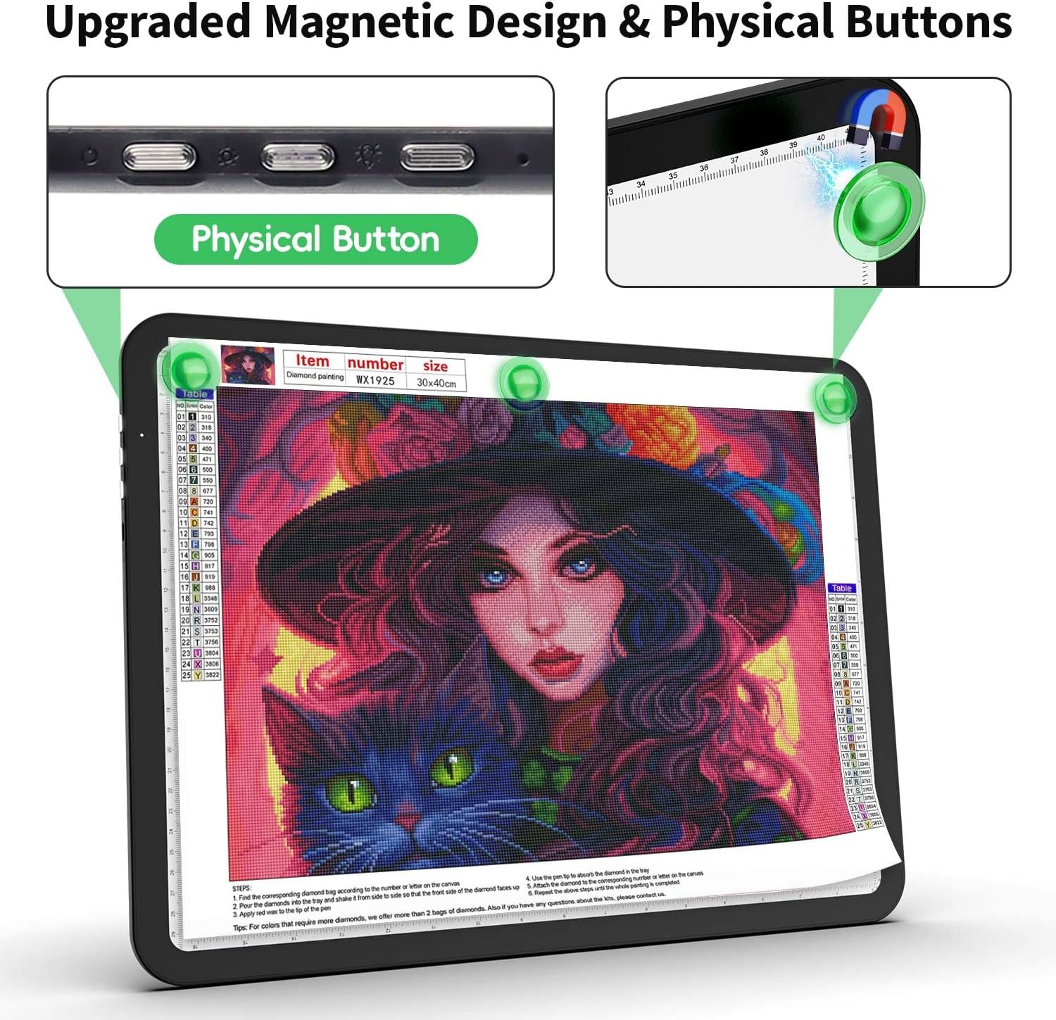 - 【Side Physical Button Design & Magnetic Design】 The wireless A3 light board equipped with physical buttons on the side, so that you will no longer accidentally turn on/off the light pad when creating, improving your creative experience. In addition, the 4 magnets can be adsorbed around the light pad, which can firmly fix diamond painting canvas/paper/X-ray or other things on the surface of the light box, bringing great convenience to your creation.