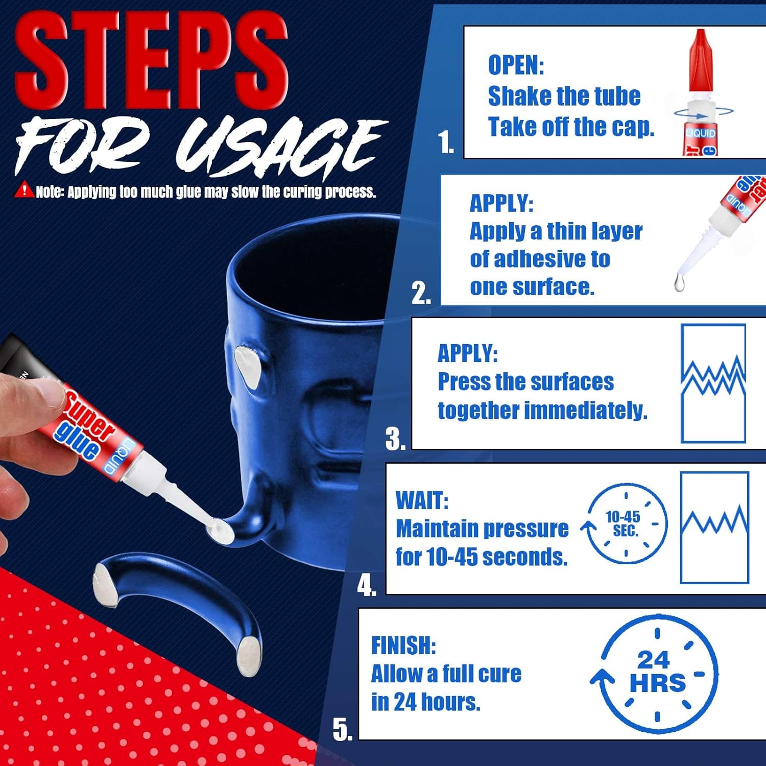 - Super Glue LIQUID - Fast Penetrating Formula, Our high-fluidity liquid adhesive sets in 10-45 seconds (full cure in 24 hours) for quick repairs. Important: Apply thinly to prevent whitening (common with cyanoacrylate glues). For better control, try our Non-Drip Super Glue GEL version.