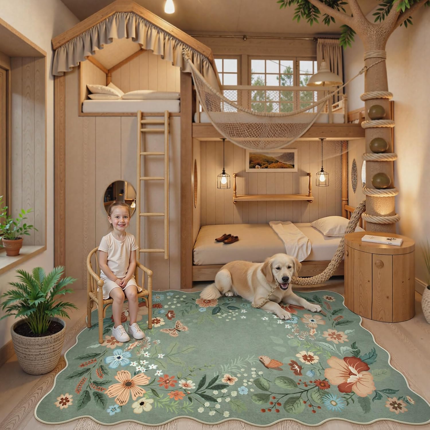 Beeiva Washable Rug 6x9 - Scalloped Floral Printed Soft Non Slip Kids Rugs for Bedroom Ultra-Thin Low Pile Boho Green Area Rug Aesthetic Throw Carpet for Living Room Playroom Dorm Office(Green,6x9ft)