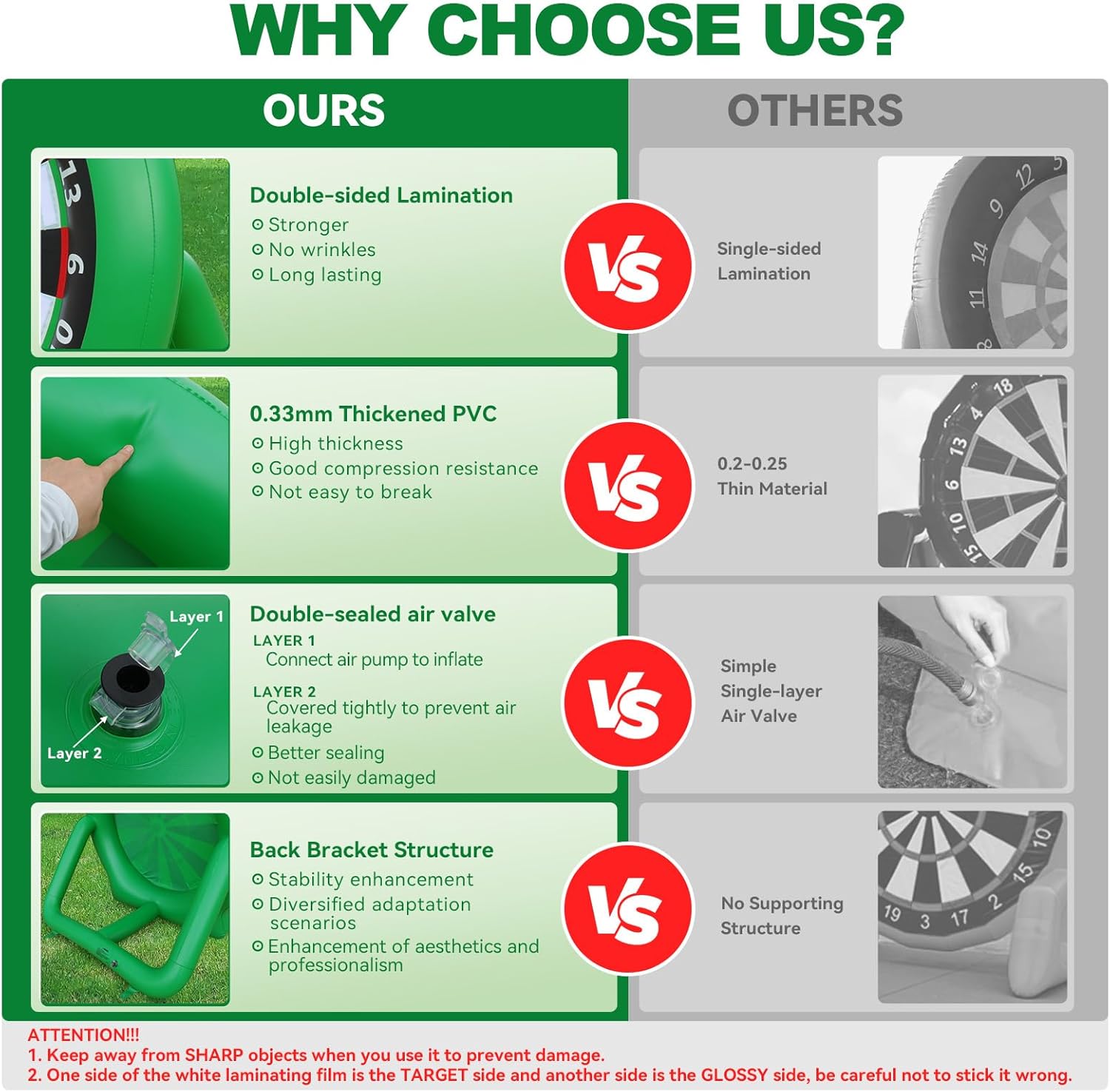 - Get Together to Play: Waterproof dart board is equipped with 20*golf balls with 1*grass mat and 1*scoreboard, 4*sticky balls, 2*soccers with 1*soccer pump, 1*electric air pump with 3*replacement nozzles, 1*carry bag, 4*stakes and 2*repair patches. It can effectively increase the fun and interactivity, which is an excellent match for family and friends entertainment