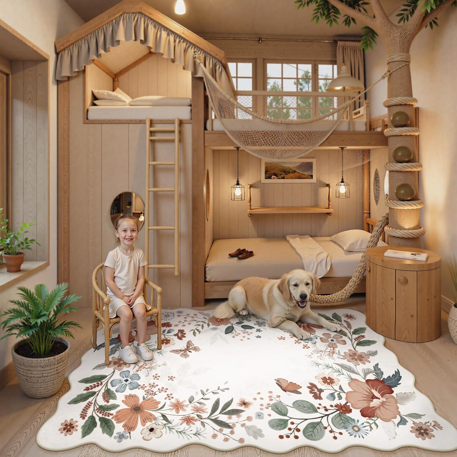 Beeiva Living Room Area Rug 6 x 9 - Scalloped Floral Printed Boho Flower Rugs for Bedroom Playroom Soft Non Slip Large Aesthetic Carpet for Nursery Dorm Office(Beige,6x9ft)