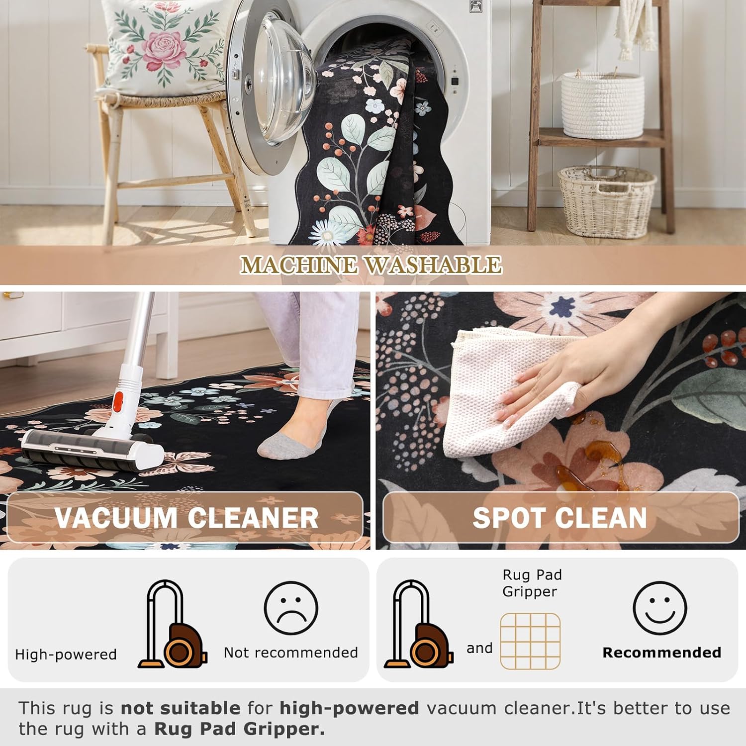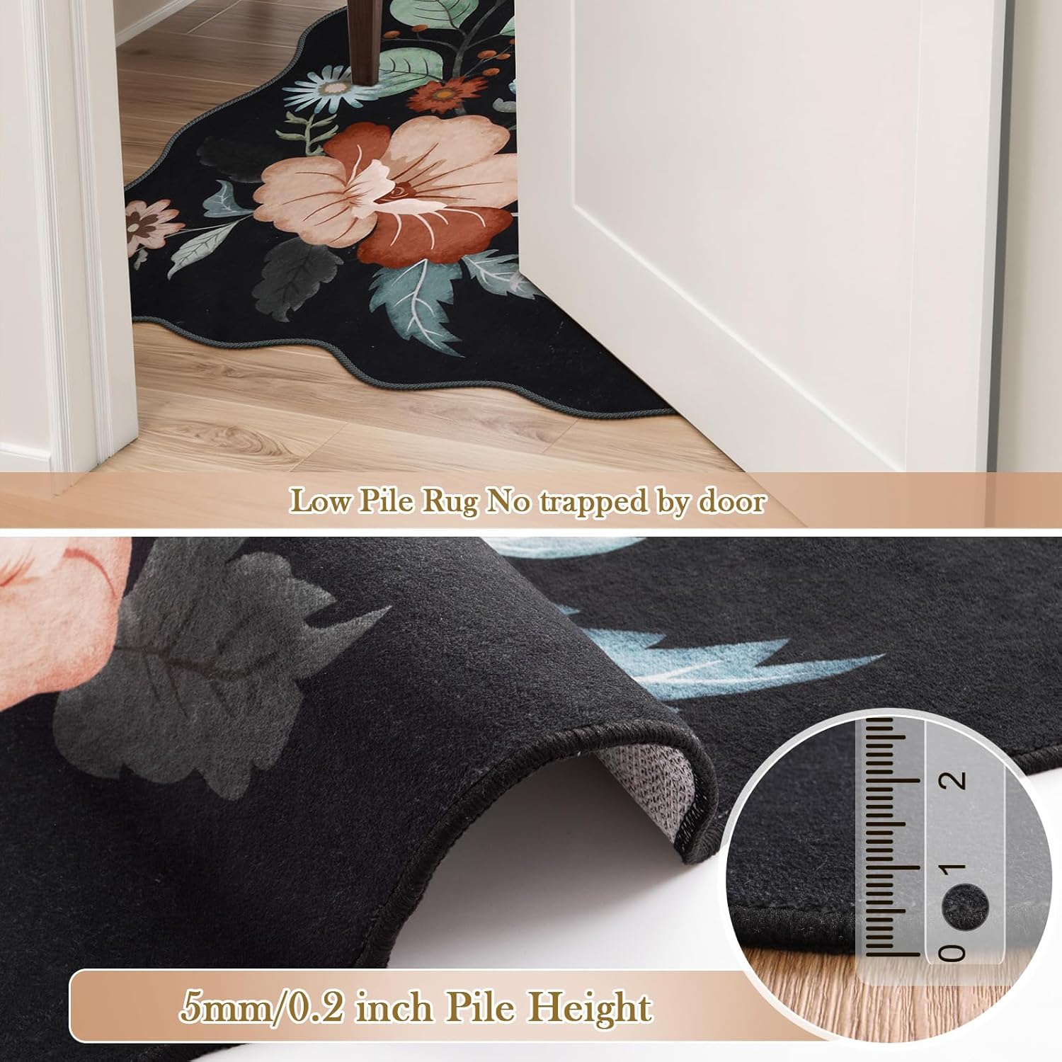 Beeiva Washable Rugs 8x10 for Living Room - Scalloped Floral Printed Soft Non Slip 8 x 10 Area Rug for Dining Room Boho Flower Ultra-Thin Aesthetic Carpet for Kids Room Dorm Office(Black,8x10ft)