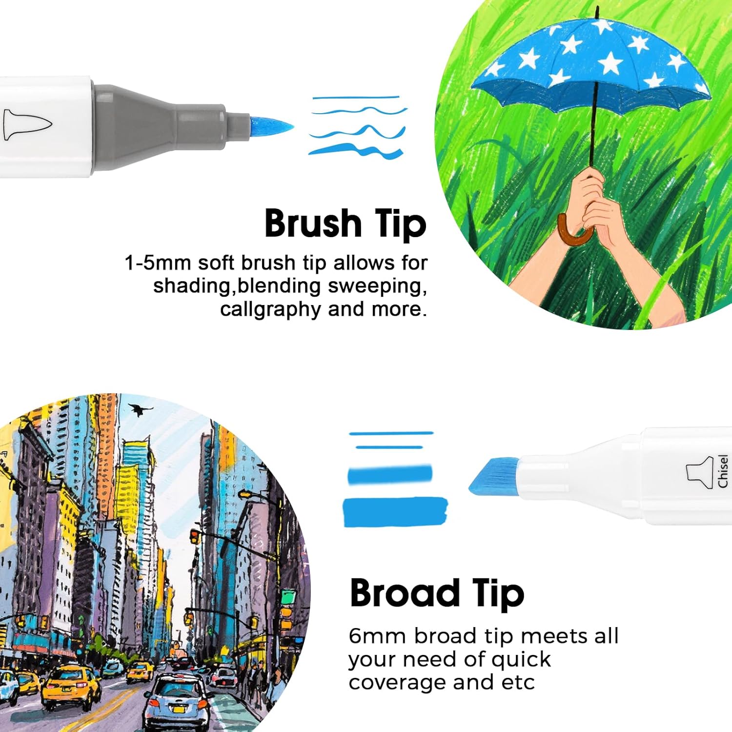- 【VERSATILE DUAL TIP DESIGN】 Each of our Alcohol Markers comes equipped with a dual tip—1mm fine tip for precision detailing and a 1-6mm brush tip for bold strokes. Perfect for calligraphy, sketching, and coloring books without bleeding, providing the versatility artists need.