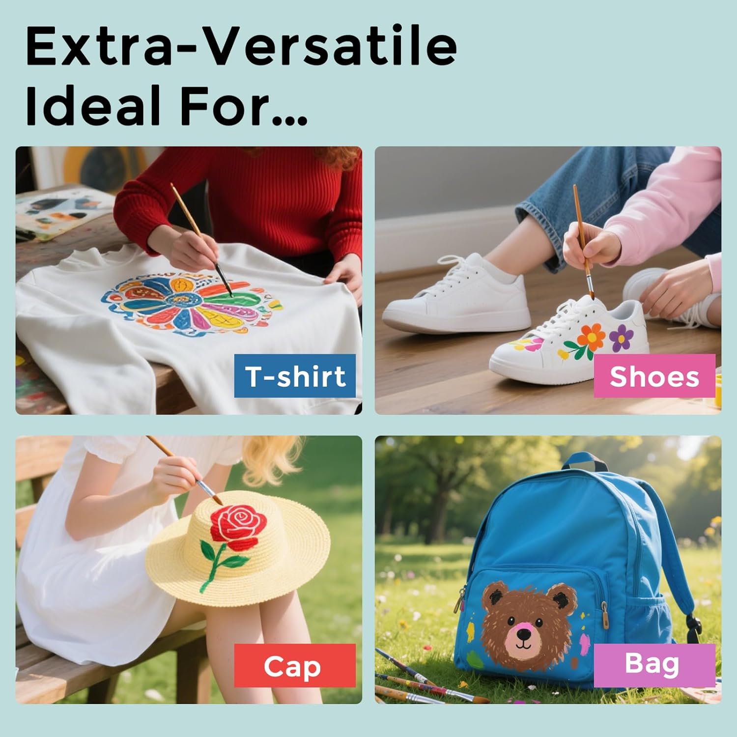 - 【All-in-One Fabric Paint Set】: Get creative with 24 bold fabric paint in a permanent set of fabric paints designed specifically for clothing(60 ml/2 oz). The set also includes 10 professional brushes, 18 reusable stencils and a color palette, perfect for DIY projects, crafts and customized gifts.
